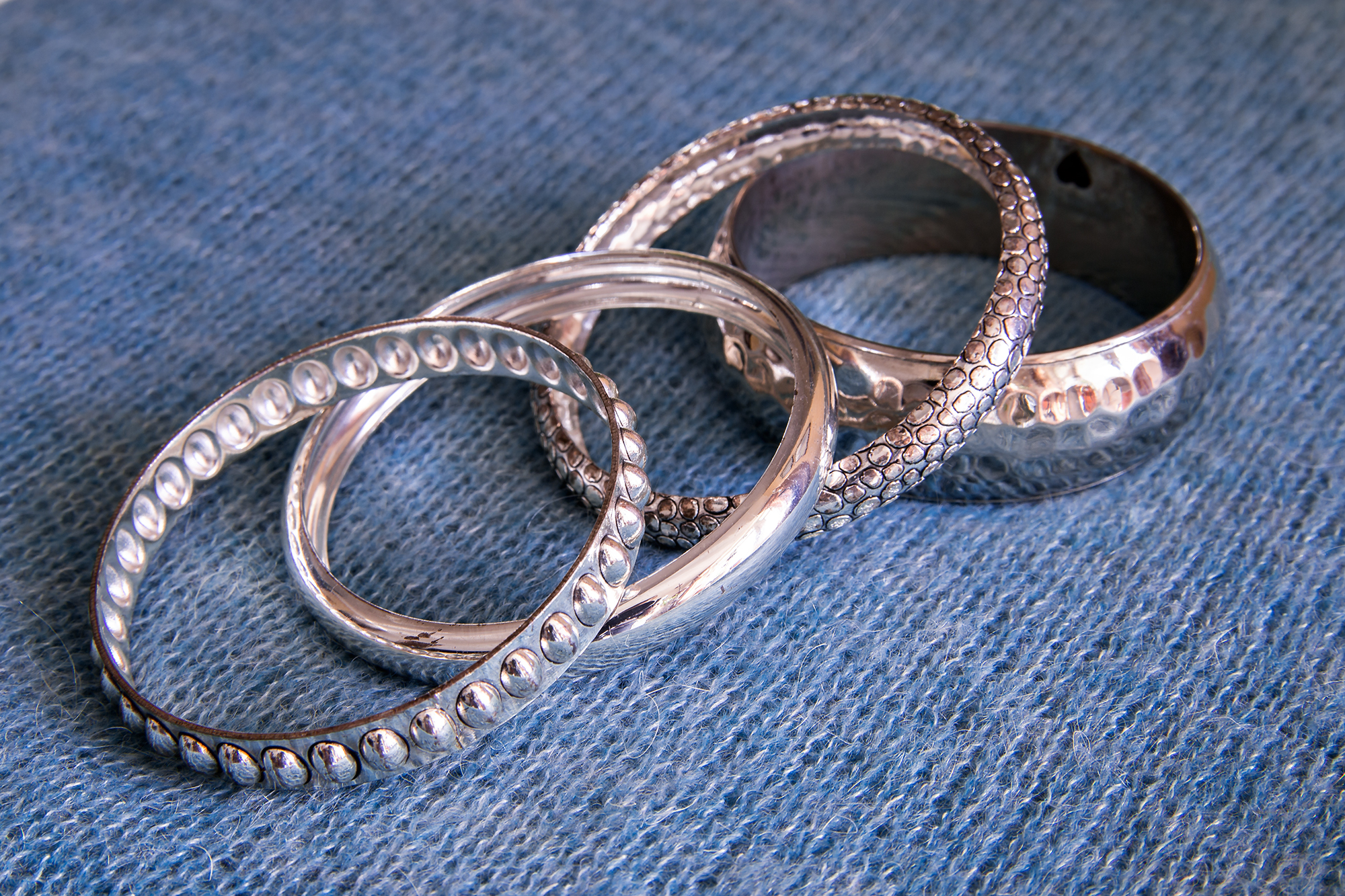 Здравствуйте, противопоставление фактур - гладкие, блестящие, металлические браслеты на голубом пушистом мягком фоне.
