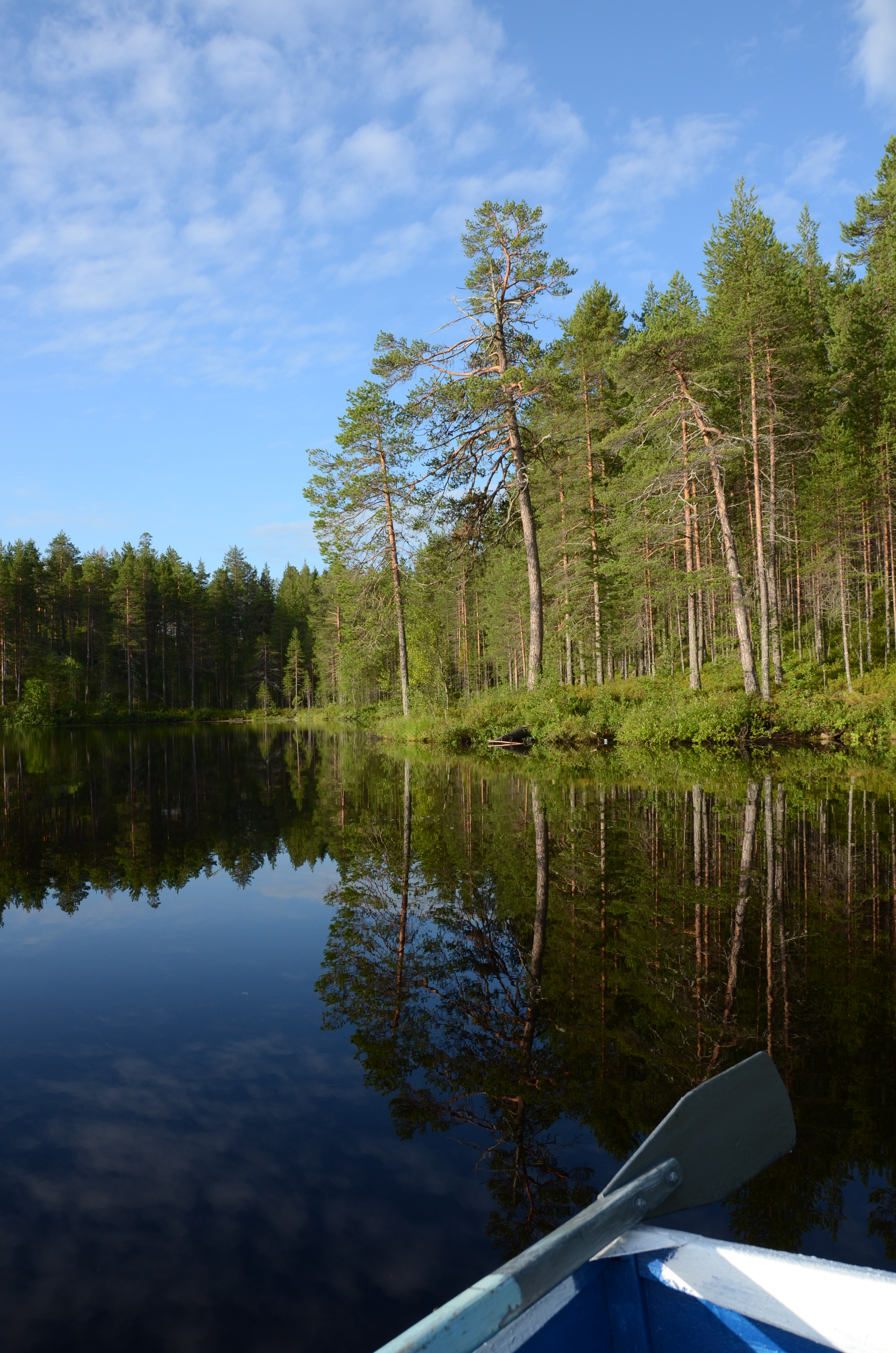 С отражениями в воде зимой сложновато, поэтому представляю кадр прошлого лета (Карелия, раннее утро), который строился так, чтобы показать на спокойной воде озера в ясную погоду отражения сосен на берегу и облаков. Корма лодки с веслом включена в кадр сознательно, чтобы подчеркнуть "неоткрыточность" кадра и чтобы впоследствии была возможность вспомнить все, что с кадром связано.
