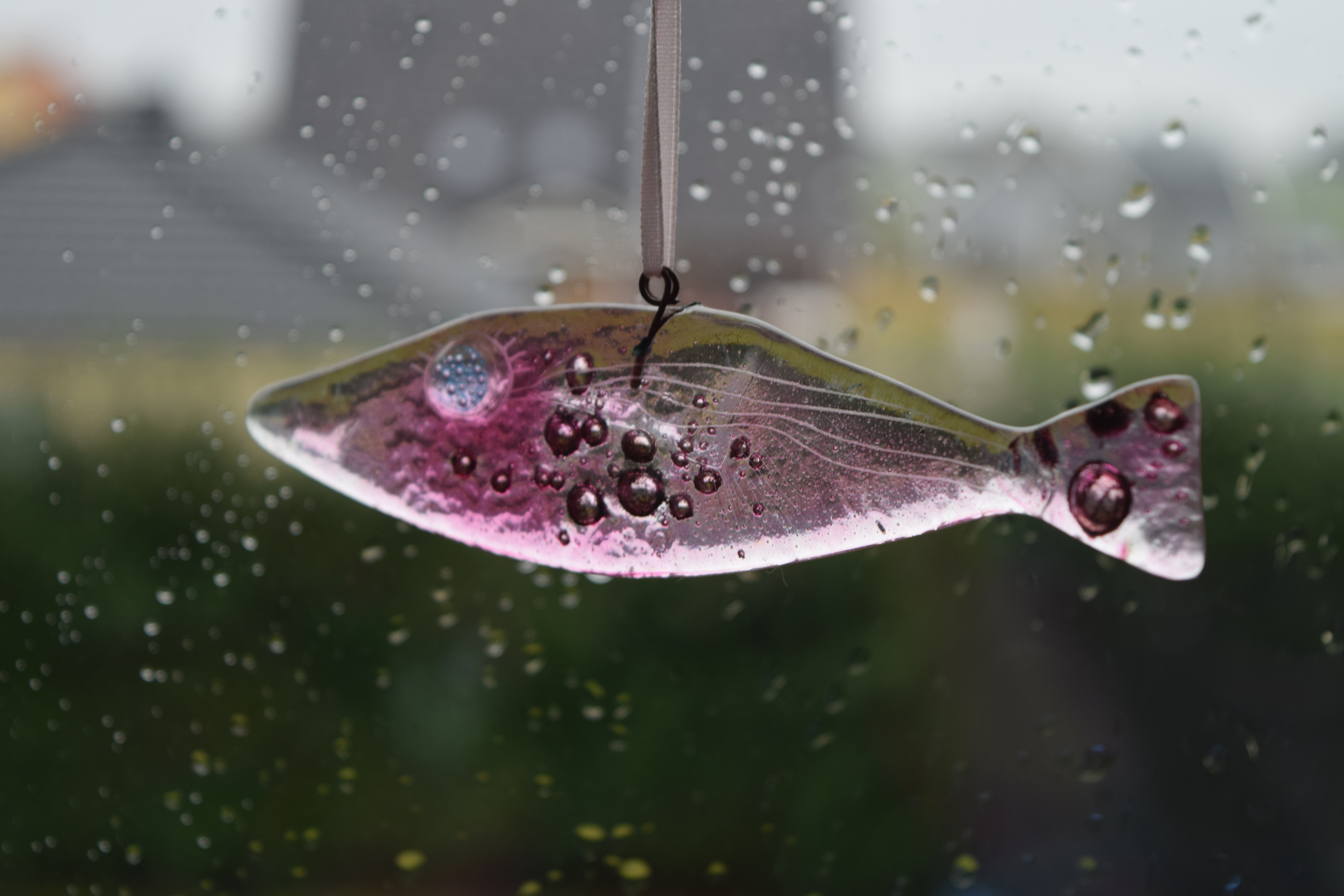 Мне показалось неплохое решение: окно, дождевые капли и стеклянная рыбка с пузыриками...