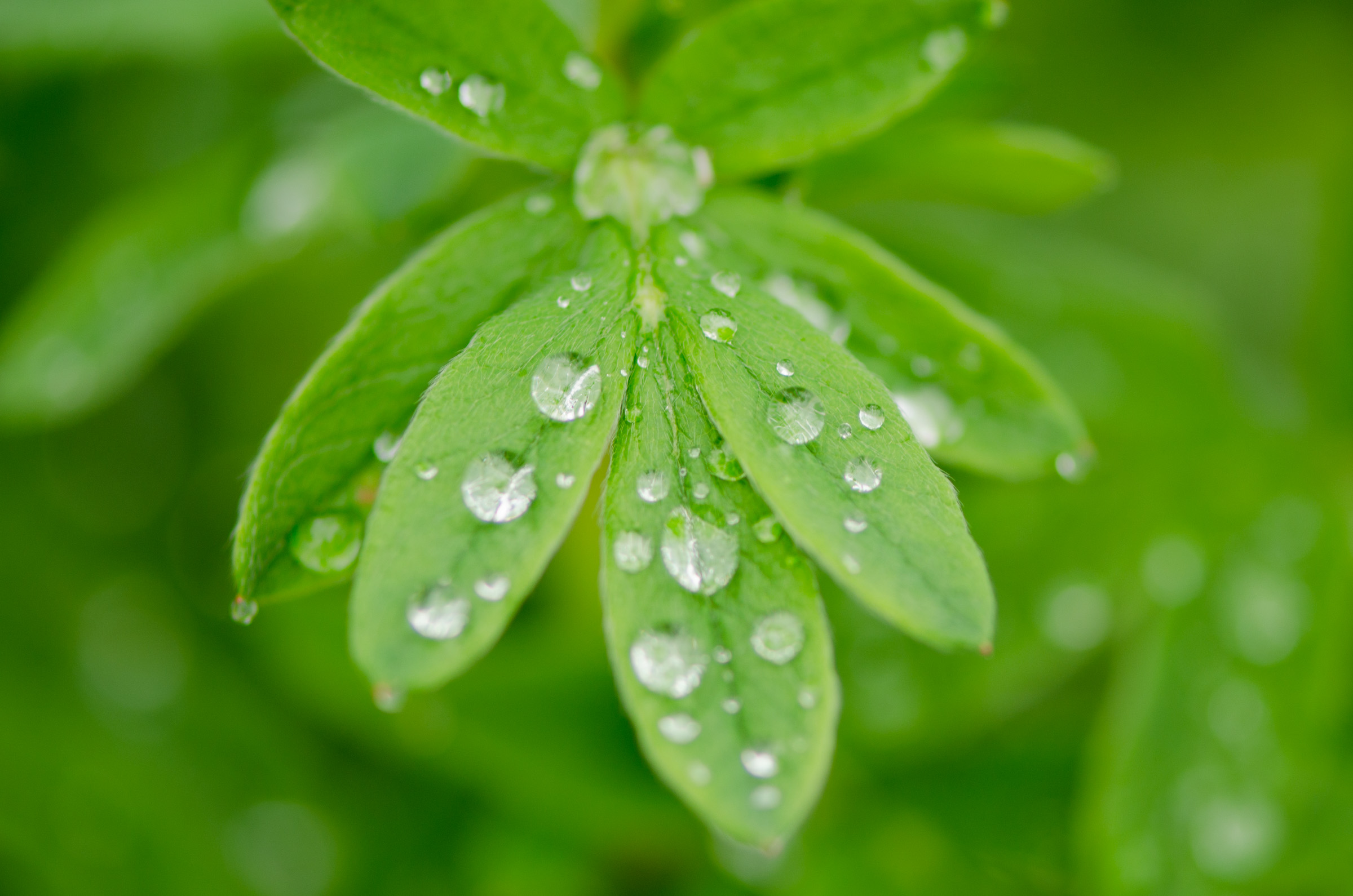 По хорошему, тут нужно макро-объектив и с ним плотно работать. Может быть это он и есть, 105/2.8. Но с ГРИП надо явно дорабатывать и нижнюю часть в фокус. А можно поискать контровой свет, чтобы капли немного светились, и при желании даже лучевые фильтры применить