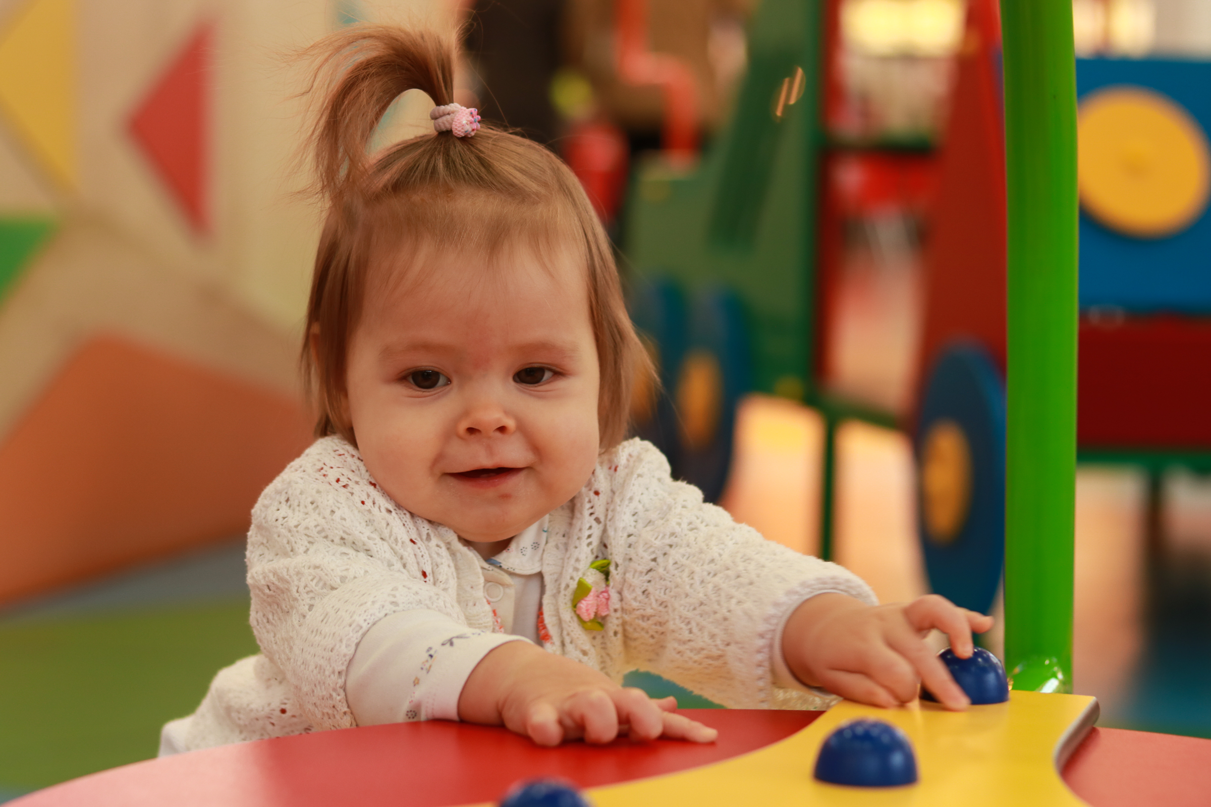 На детской площадке в торговом центре. Мне кажется кадр получился позитивным за счет ярких, сочных цветов на заднем плане