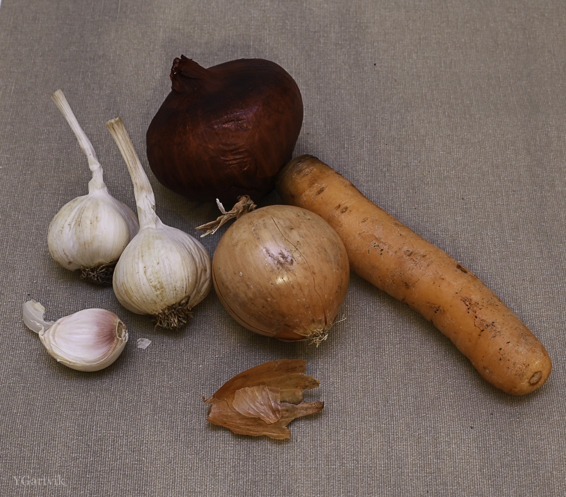 1 морковь хочется развернуть вправо, то есть как зеркальное отображение положения чеснока. В данном случае линия моркови отделяет натюрморт от правого угла кадра, и этот угол смотрится пустовато.
