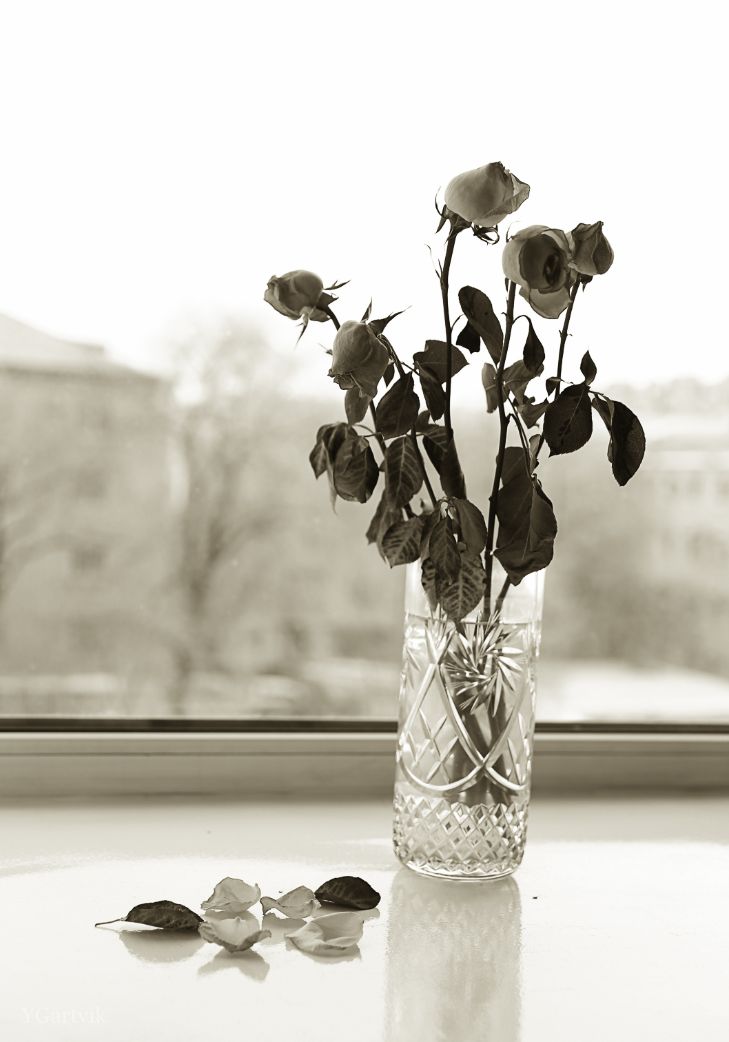 Юрий, хорошо подчеркнули вазу с цветами на окошке. Тонирование удачно дополняет не совсем новый, немного увядший букет , придает ему стиль ретро. Освещение равномерное, букет смотрится объемным , светлым. Листики на подоконнике уравновешивают композицию. Сами бутоны немного грустно опустили головы, поникли.