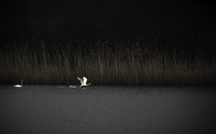 Отлично поймали момент! Лебедь взлетает, другой смотрит ему в след.