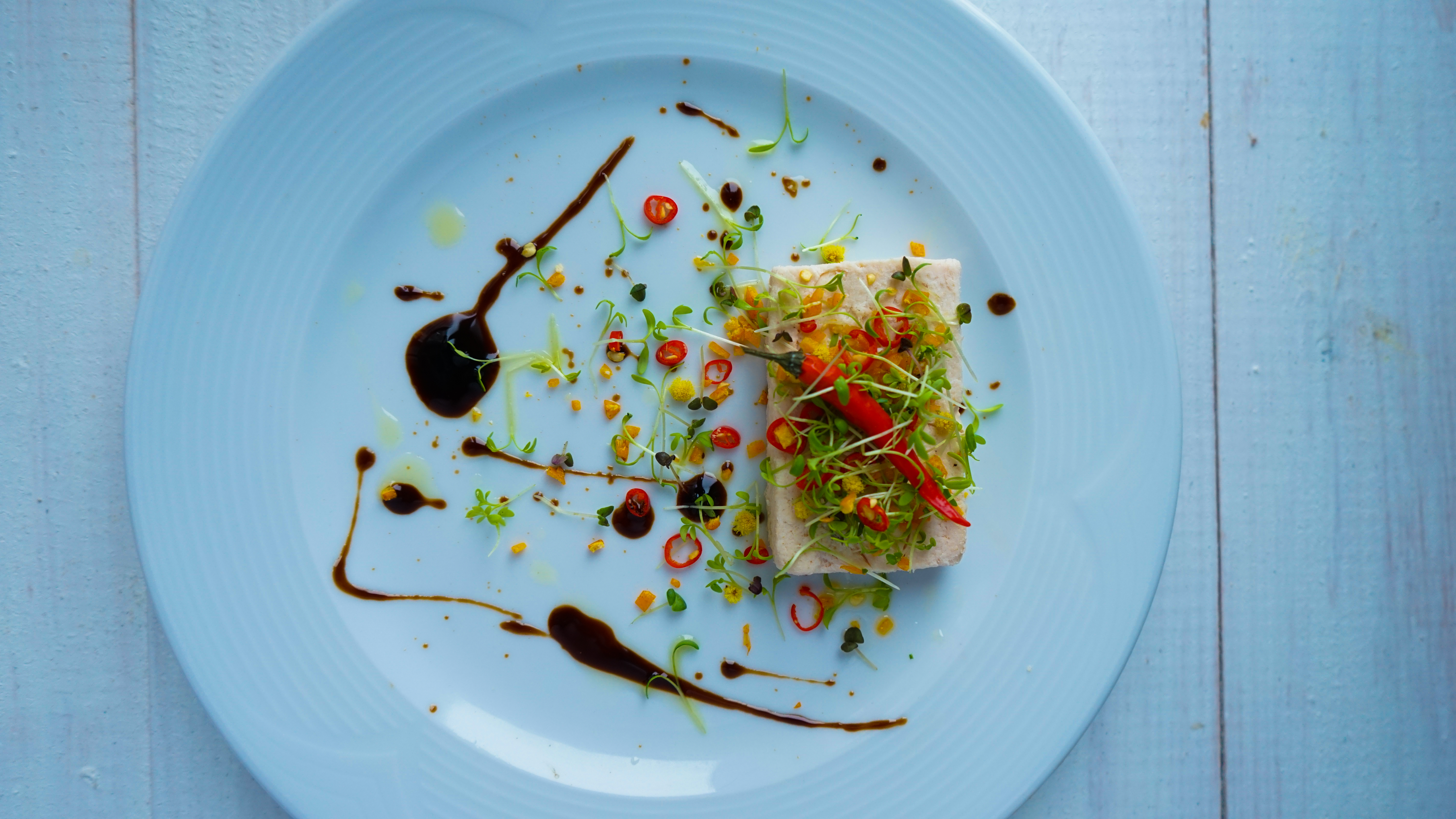 Филе цыпленка корнишон, томленое с листиками тимьяна, белым вином и мускатным орехом. Подается с трюфельным маслом и загущенным красным вином. Обсыпается ростками шпината, базилика, кресс салата, цедрой апельсина, перчиком чили и ростками кумквата.