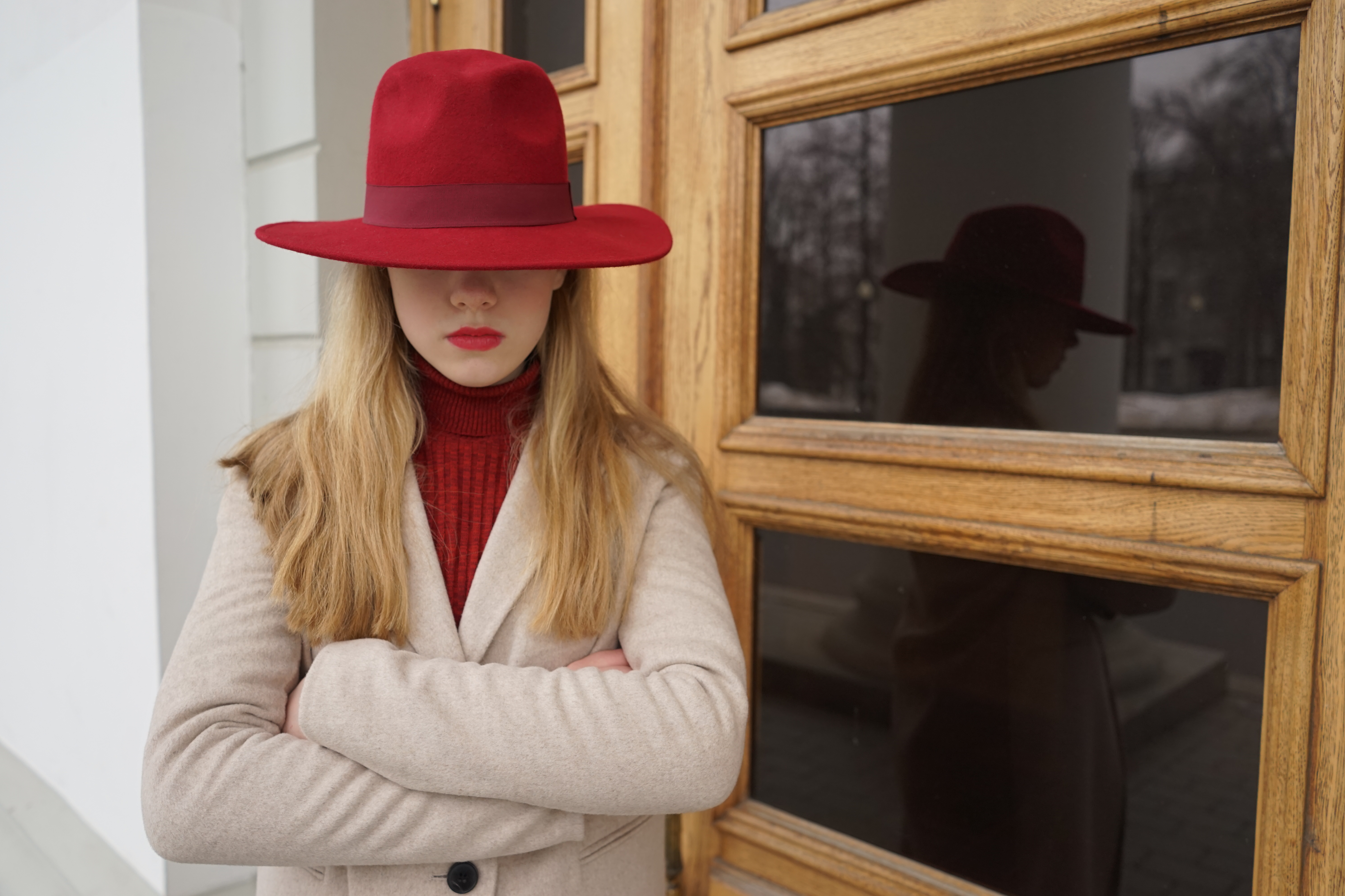Очень приятный, стильный портрет с настроением получился у вас! Яркая шляпа, скрытый от зрителя взгляд, отражение в стекле и интересный задний план.