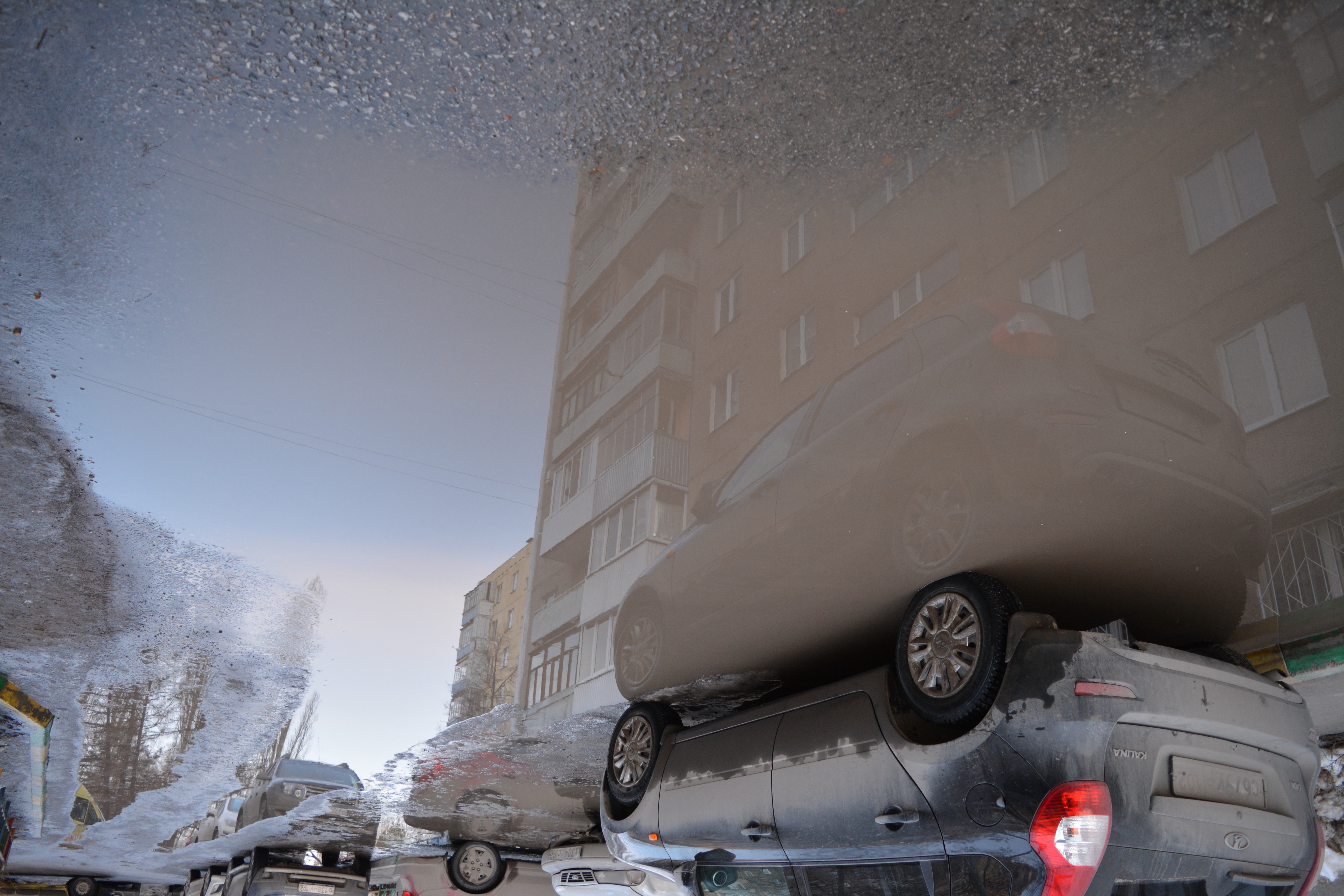 Ух, здорово вы сняли сюжет с отражением в луже! За счет перевернутости кадра смотрится очень интересно работа, в то время как отражение здания в правильной ориентации расположены. И по технике все хорошо- кадр светлый, резкий!