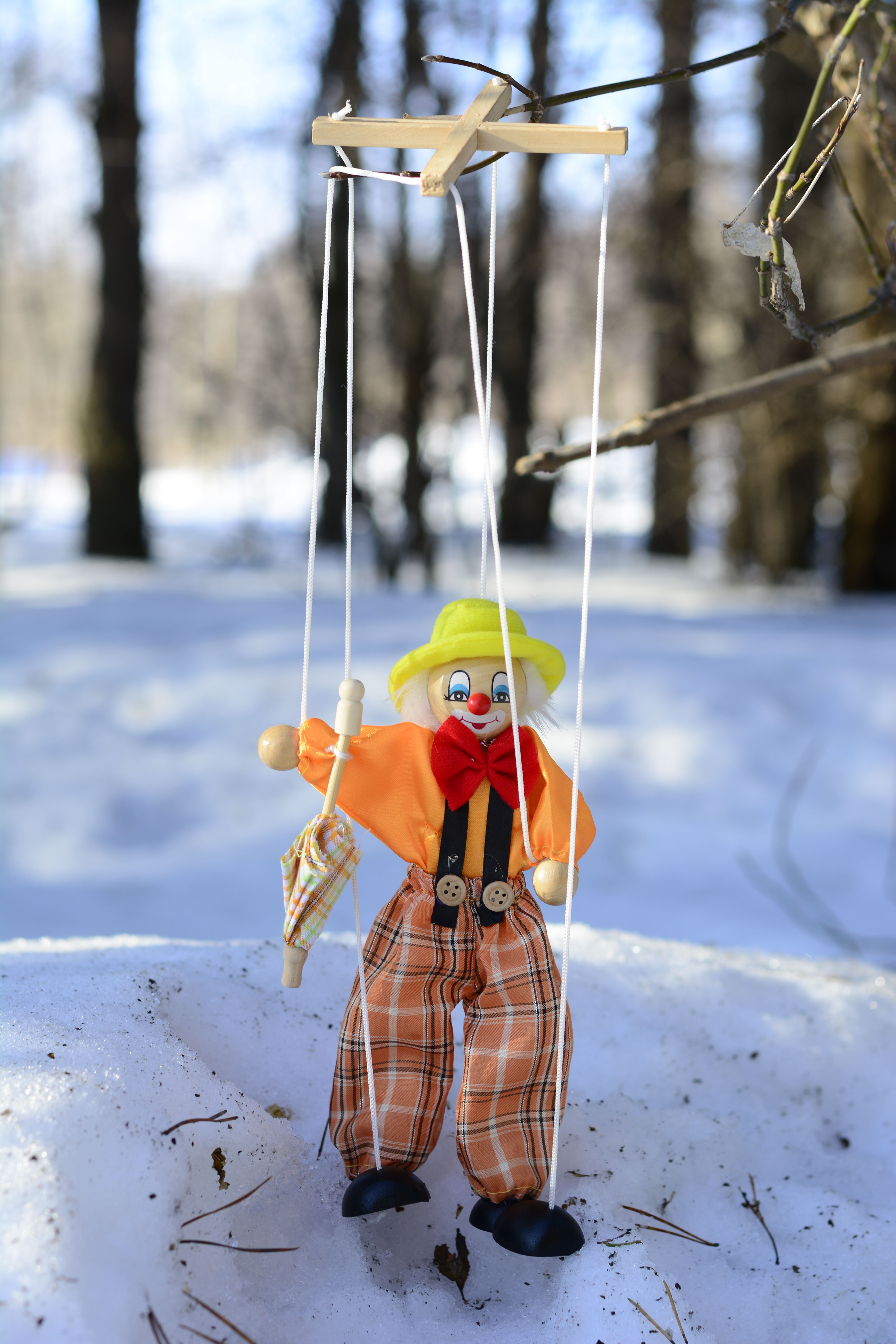 Камера сфокусирована на лице клоуна. Вертикальный формат кадра хорошо подчеркивает позу игрушки, а также веревки, на которых она подвешена.