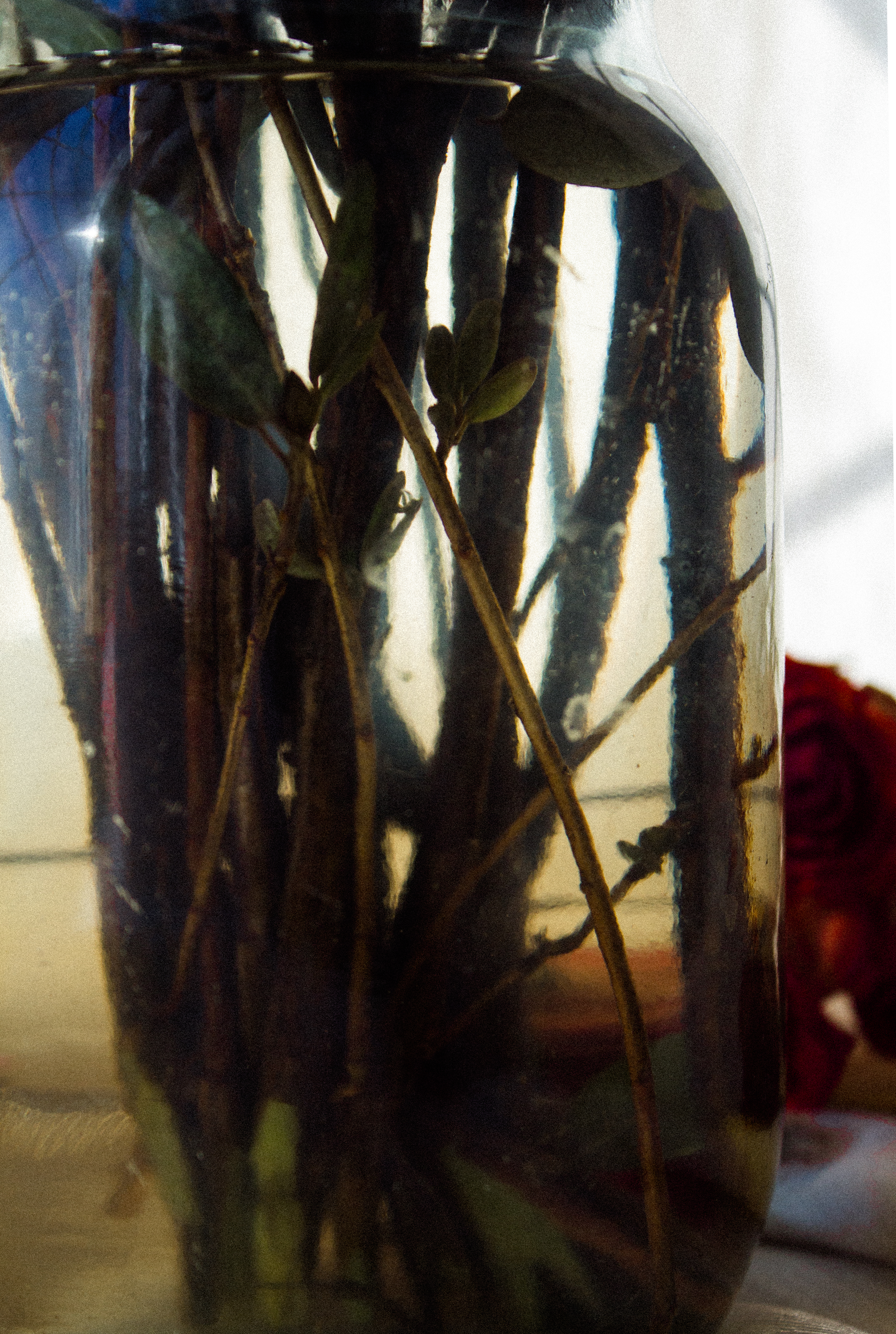 Интересно смотрится снимок. Здорово подметили, как преломляются стебельки в банке с водой - она работает как своеобразная линза.