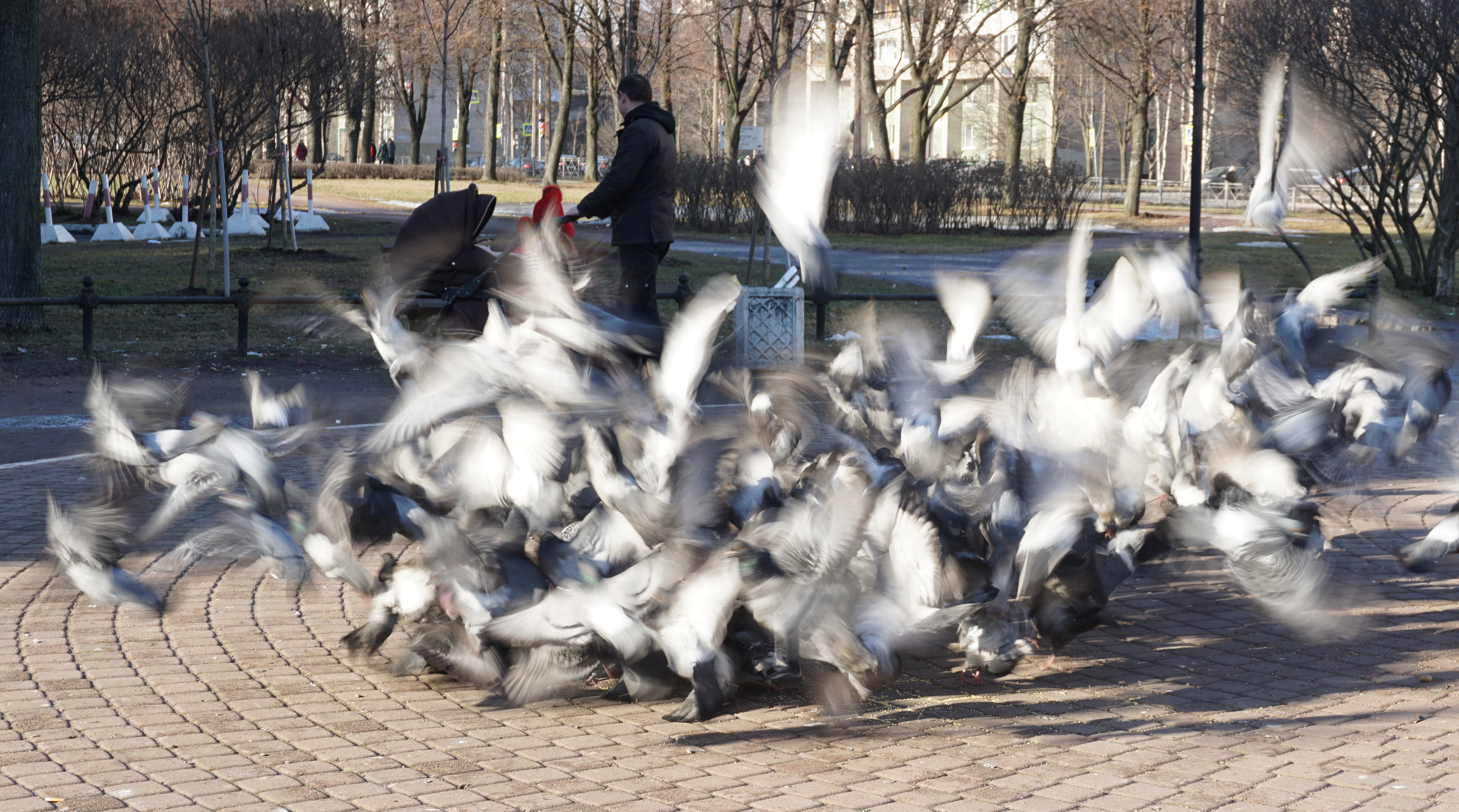Спасибо за работу! Очень красивый кадр! Живой! Подвижный! Оригинальный! Смотрится необычно и в то же время, понятно, образно, динамично! В центре внимания группа голубей, они ярко освещены. их формы размыты, но это дает явное ощущение подвижности.
