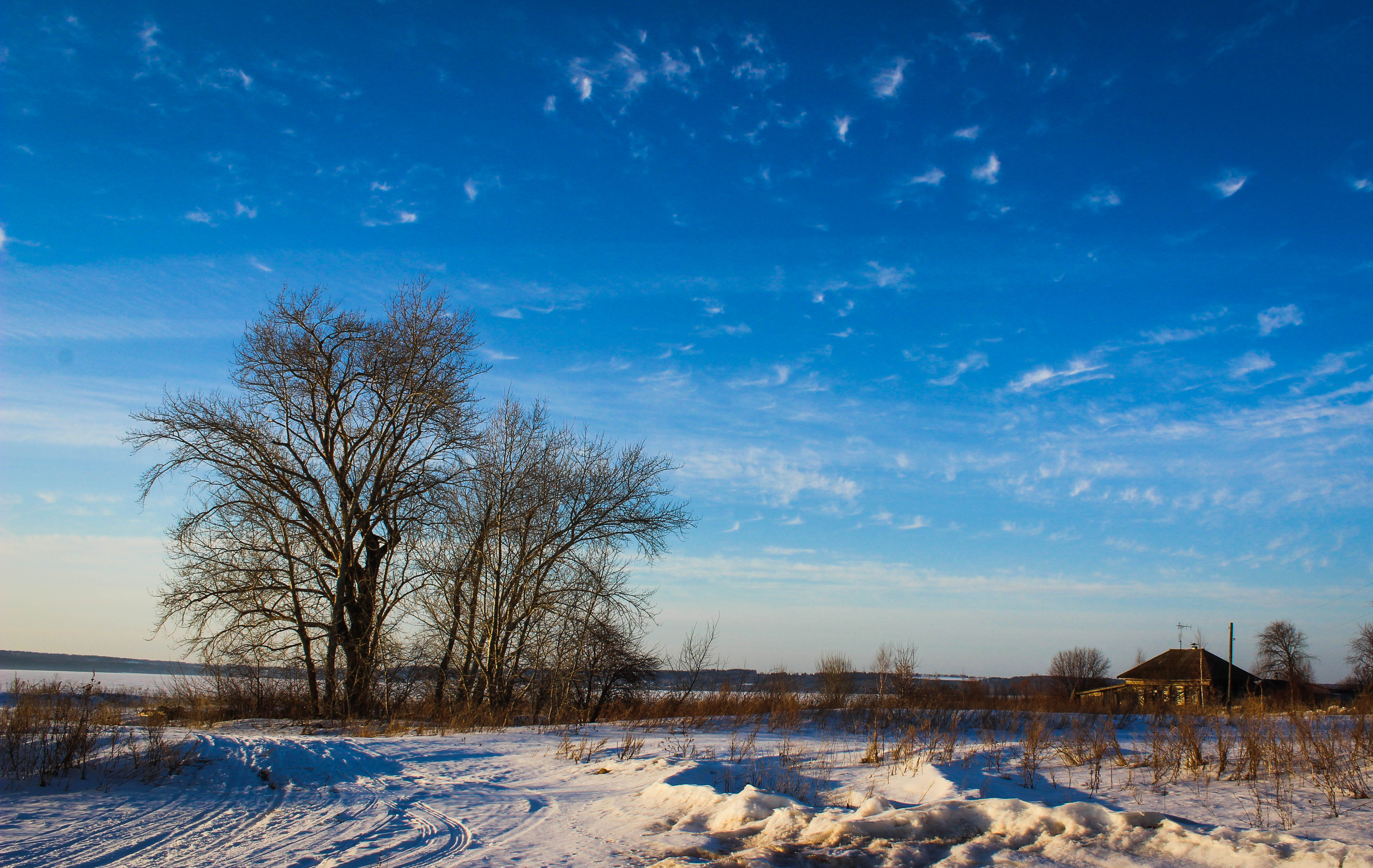 Вот вариант с землей, но здесь деревья акцентируют тоже на себя внимание и дом на заднем плане. Чистое, светлое небо и грязноватый весенний снег.