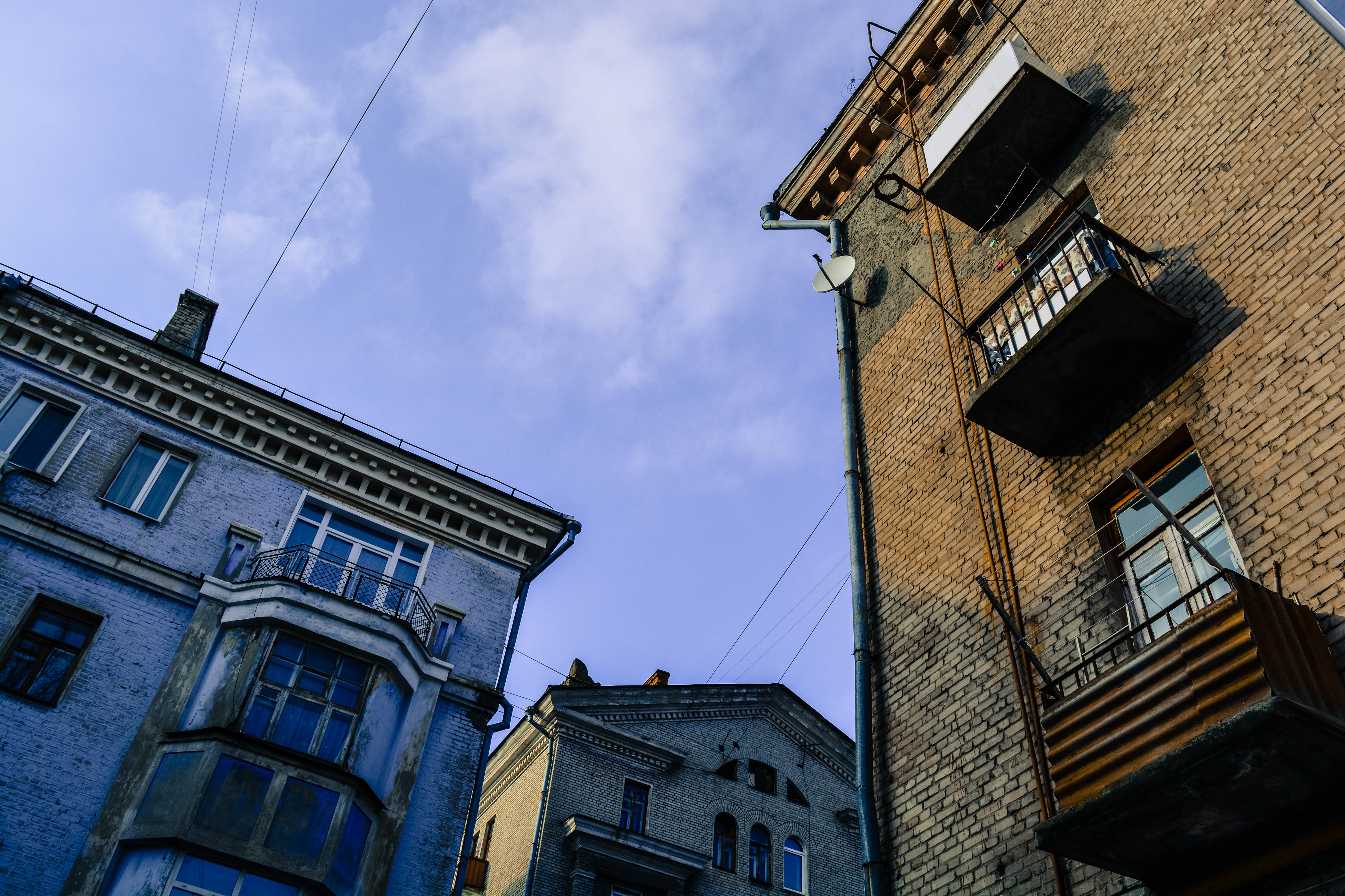 Отлично скомпоновали стены домов! Взгляд перемещается по линиям к небу. Широкий угол объектива создает наклон , все линии наклоняются к центру кадра, усиливая внимание на небе.