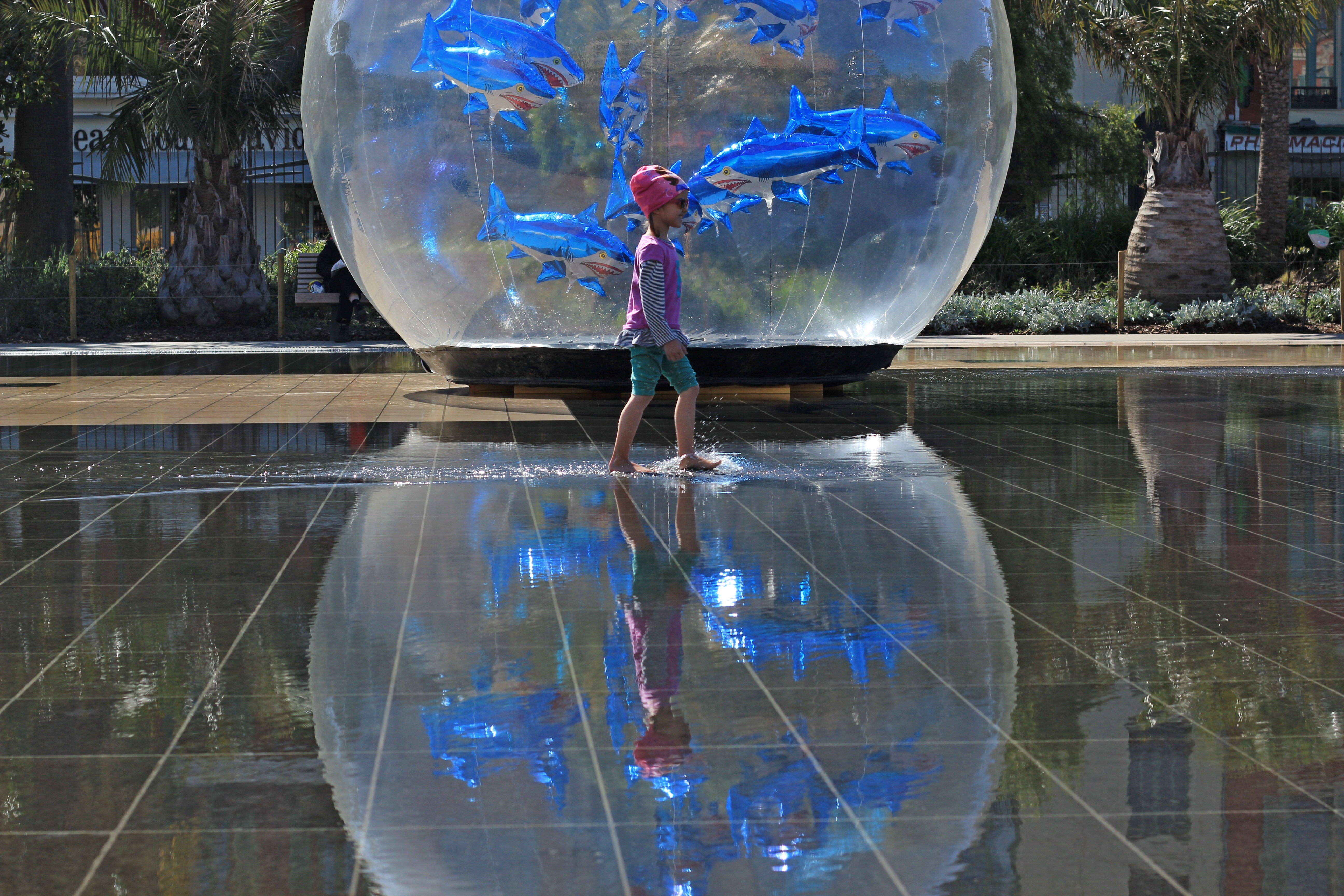обьект выделен рамками шара, который к тому же отражается в воде. линии плиток создают перспективу, вода придает динамичности кадру