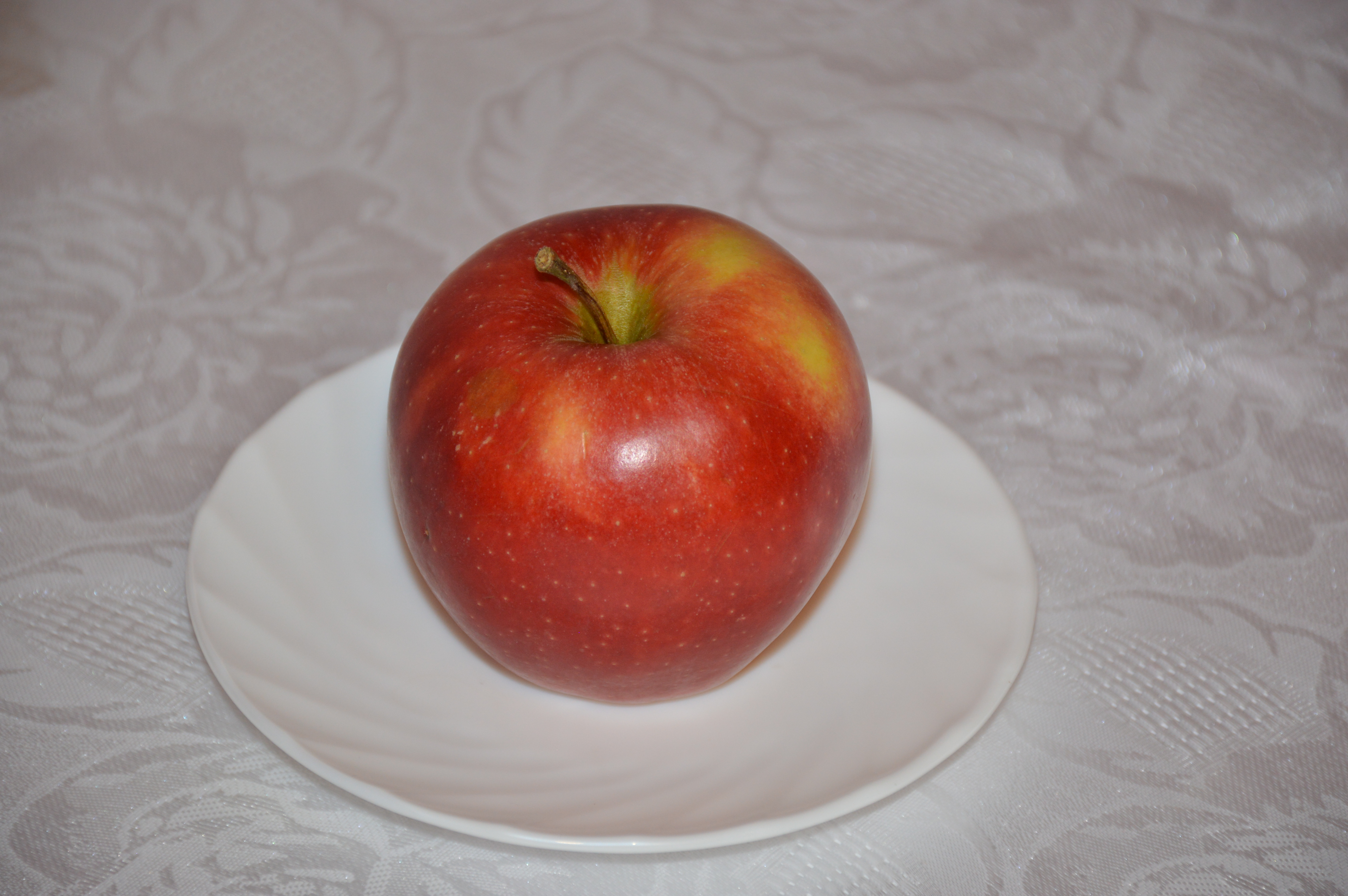 Представлена фотография яблока на блюдце. Очень удачно выбран фон. Блюдце ему под стать. А яблоко выразительно, и даже настойчиво доминирует цветом на таком фоне.