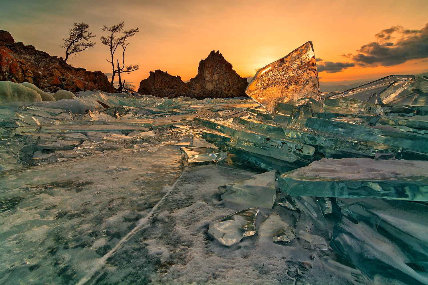 Закатное освещение делает картину максимально эффектной - лед просвечивает в лучах заката и играет разнообразными красками.