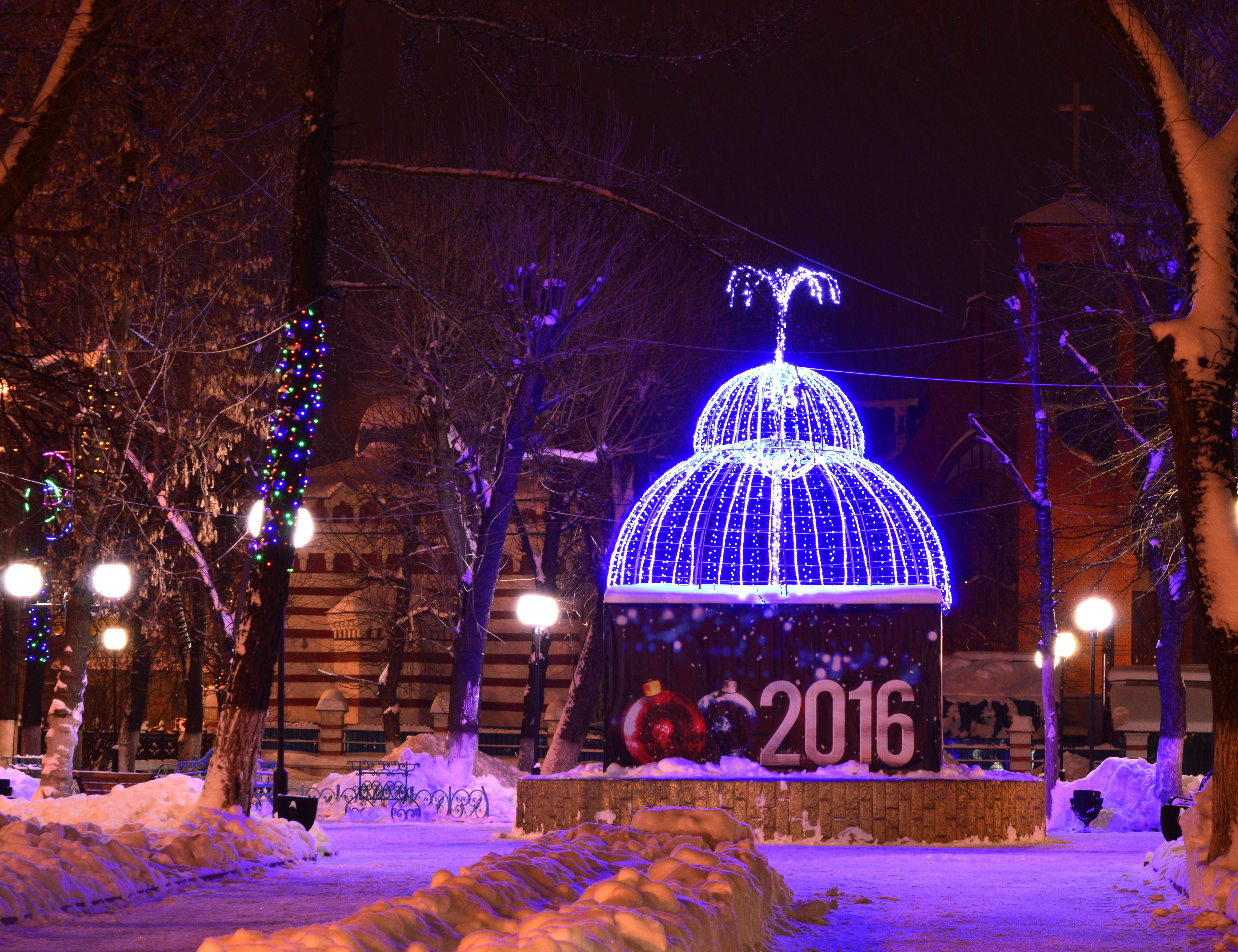 Сместили фонтан в сторону и он, конечно, не потерялся, так как активен подсветкой. Но взгляд за счет этого путешествует по кадру, а линия сугроба снизу становится направляющей, помогает в этом движении.
