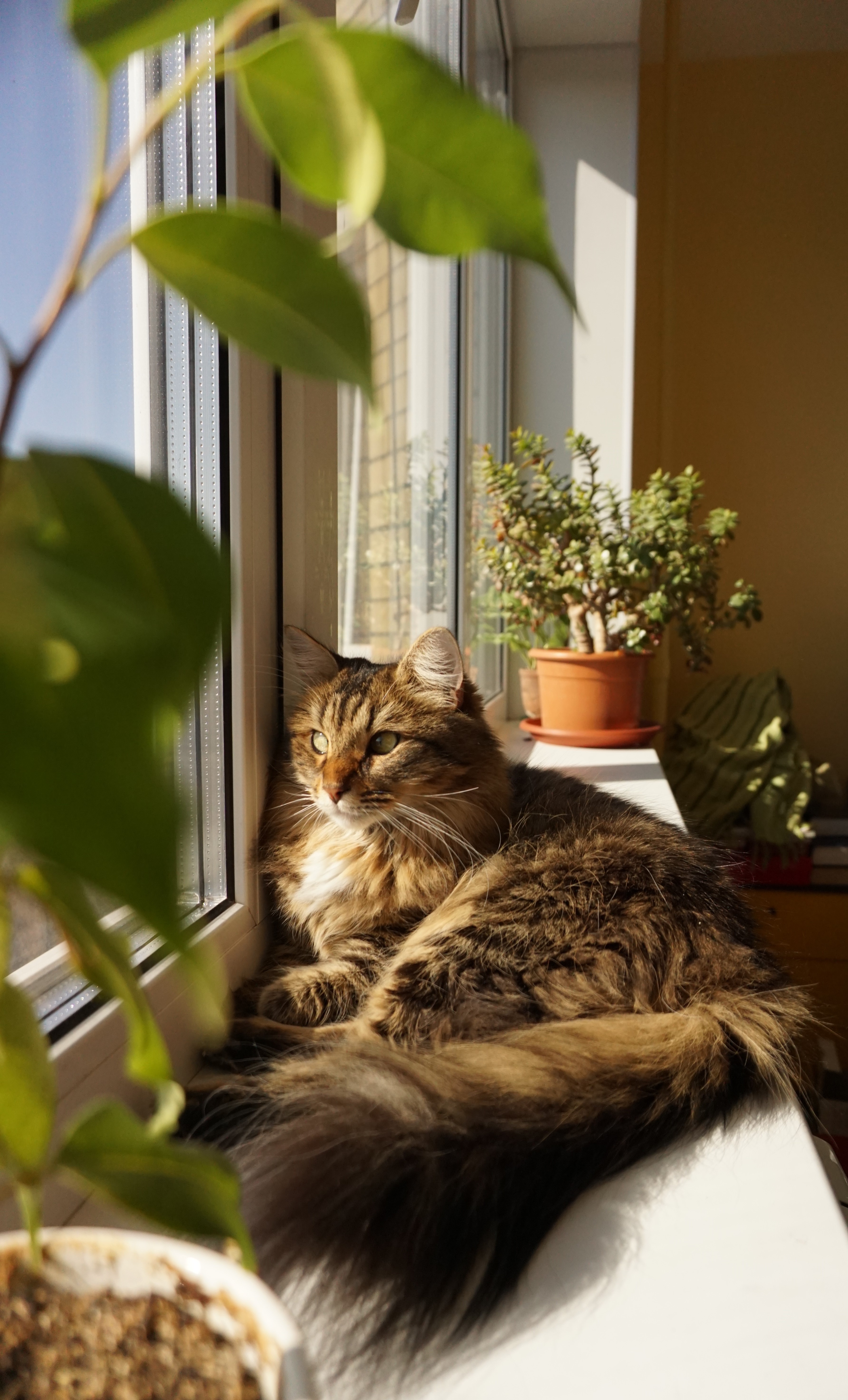 Здравствуйте! В этой фотографии понравилась многоплановость, задумчивый взгляд кошки в окно и мягкий солнечный свет