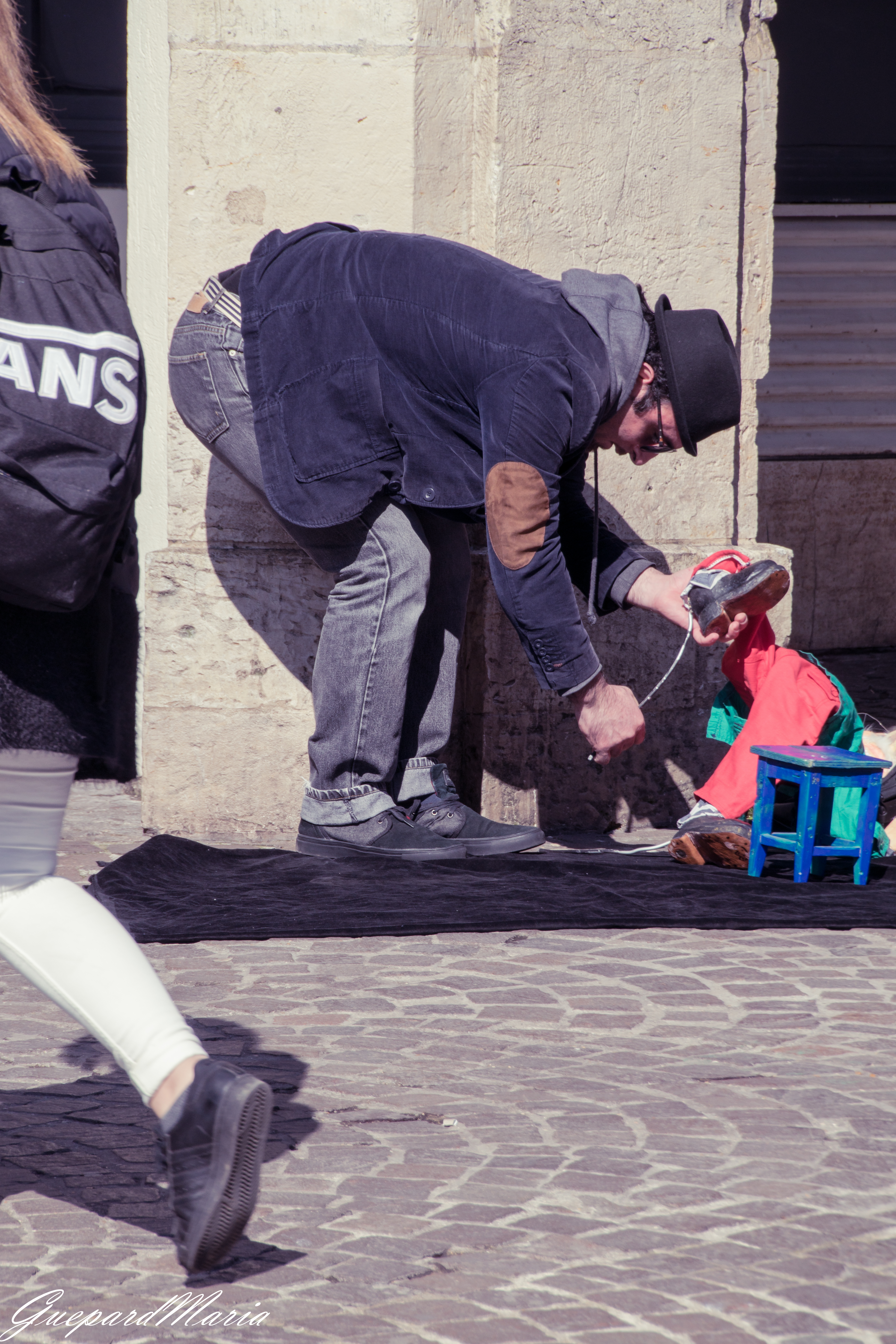 Очень странный кадр. Но вот эти башмаки, это шик. Это уличный артист с куклой, так он начинает шоу. Вытягивает куклу за башмак. Случайный кадр, репортажный. Правда, странно, что обрезана нога, прохожей девушки, но зато, так есть некий акцент на её башмак. И получается два разных башмака. Прохожей, которая не ждёт продолжения и башмак куклы, который сейчас оживёт и превратится в живую куклу.