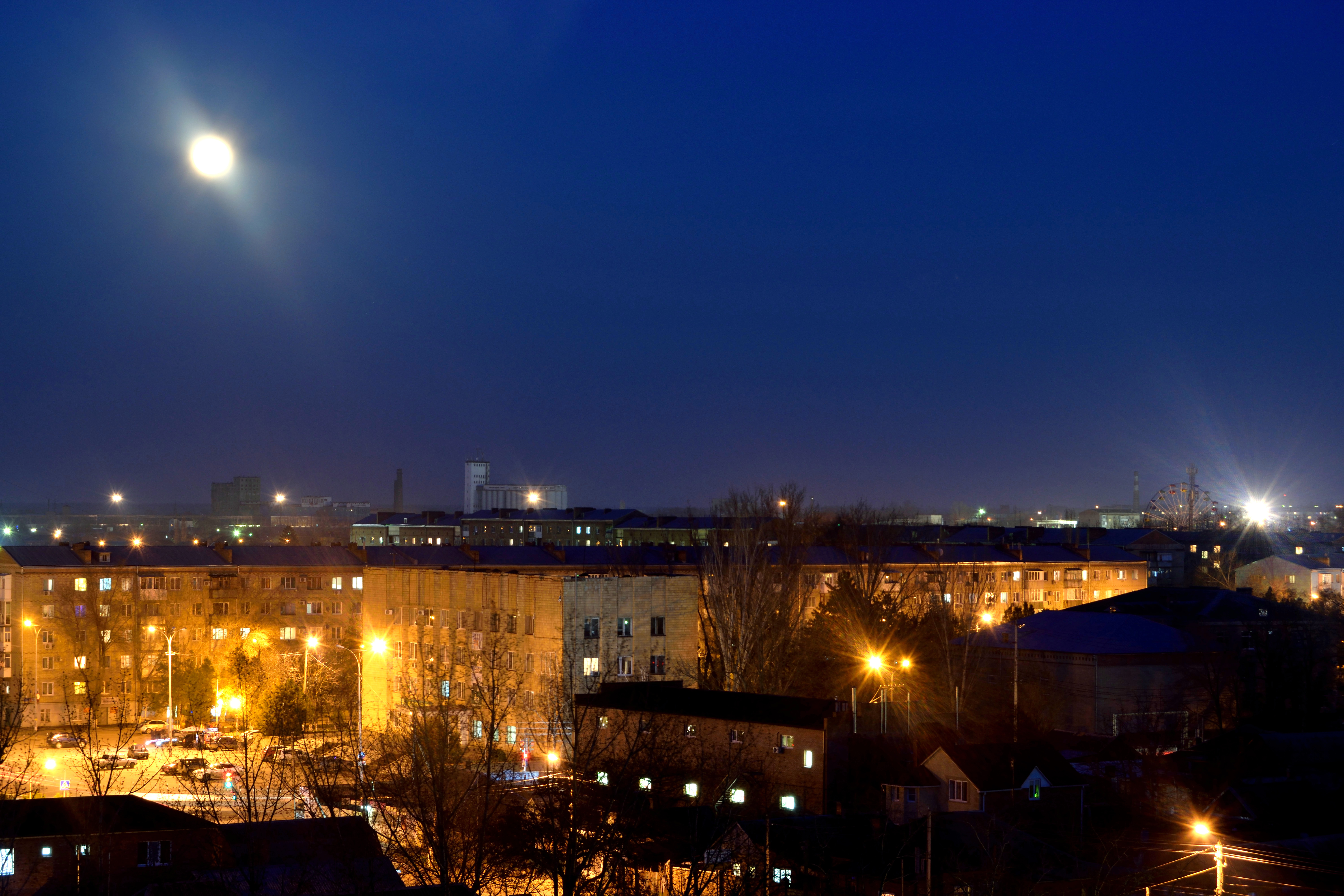 С вашей высокой точки съемки удалось показать не только двор, но и дать намек на город, читается глубина пространства. Луна во всей красе нависает над городом, интересно смотрится с лучами, и на таком потрясающем цвете неба.