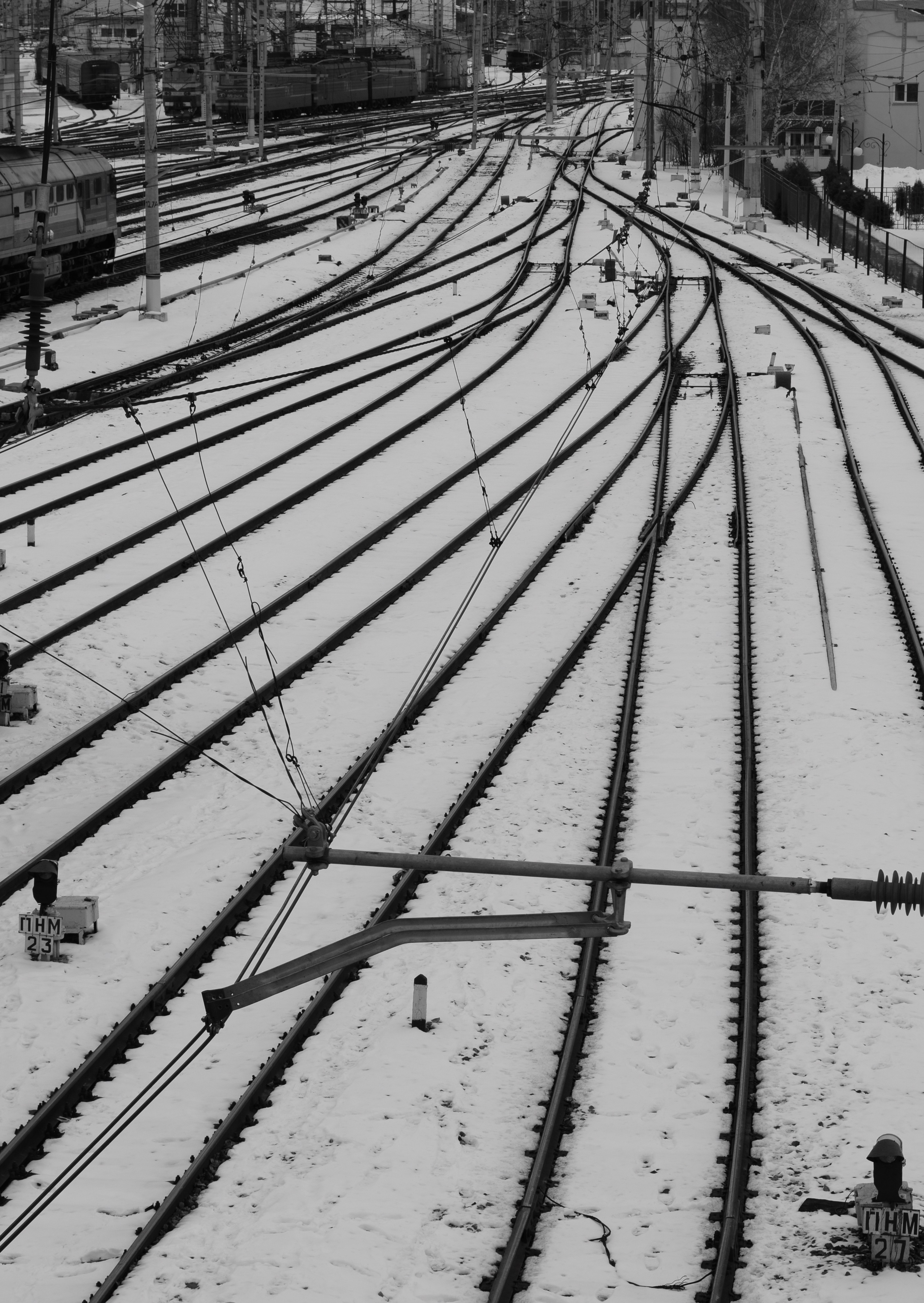 Замечательный кадр! Вы совершенно верно обратили внимание на длинные выразительные линии рельс железной дороги, они образуют интересный зрительный узор со множеством визуальных направляющих и линейных переплетений. Светлый однородный снег и тёмные рельсы образуют отличный графичный дуэт! Продолжайте в том же духе!