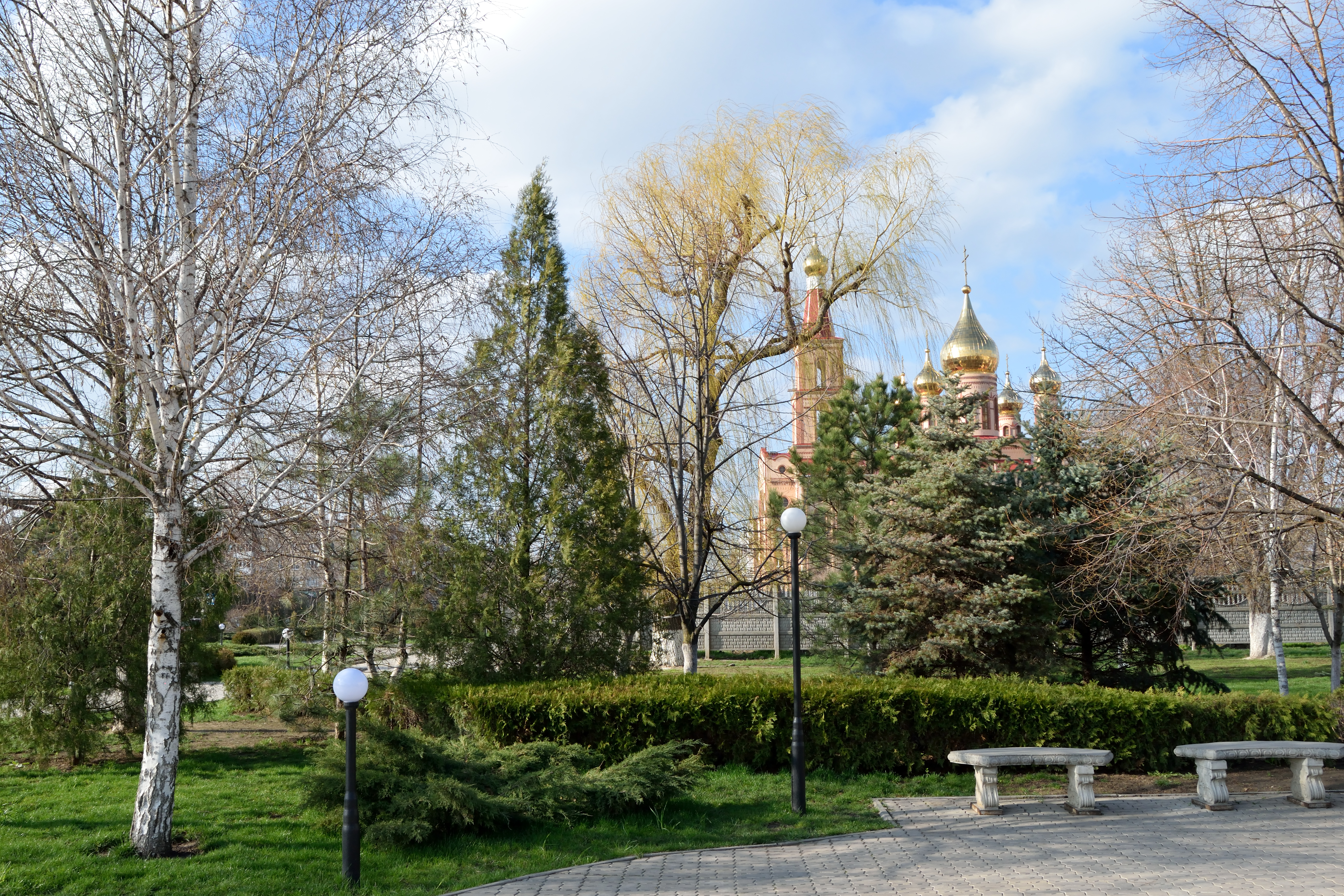 Многоплановость в кадре хорошо выявлена, а также центры внимания в виде берёзы, скамеек, фонарей, и храма на фоне.