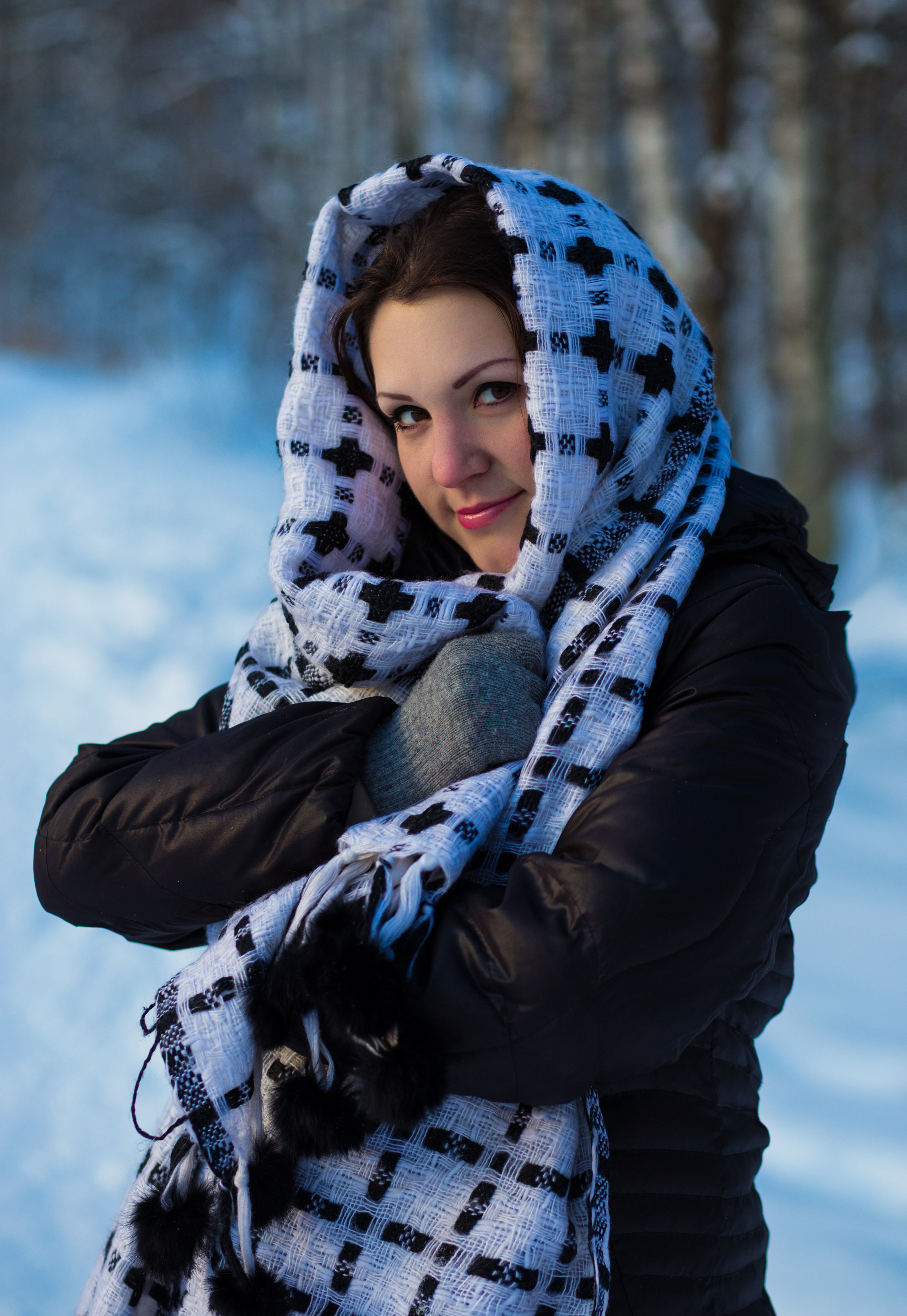 Получился портрет с хорошей композицией: нравится поза модели с диагональными линиями, придающими динамику, и с руками в кадре. Хорошо смотрится обрамление лица шарфом. Фон подобран удачно, в кадре ничего не отвлекает внимание.