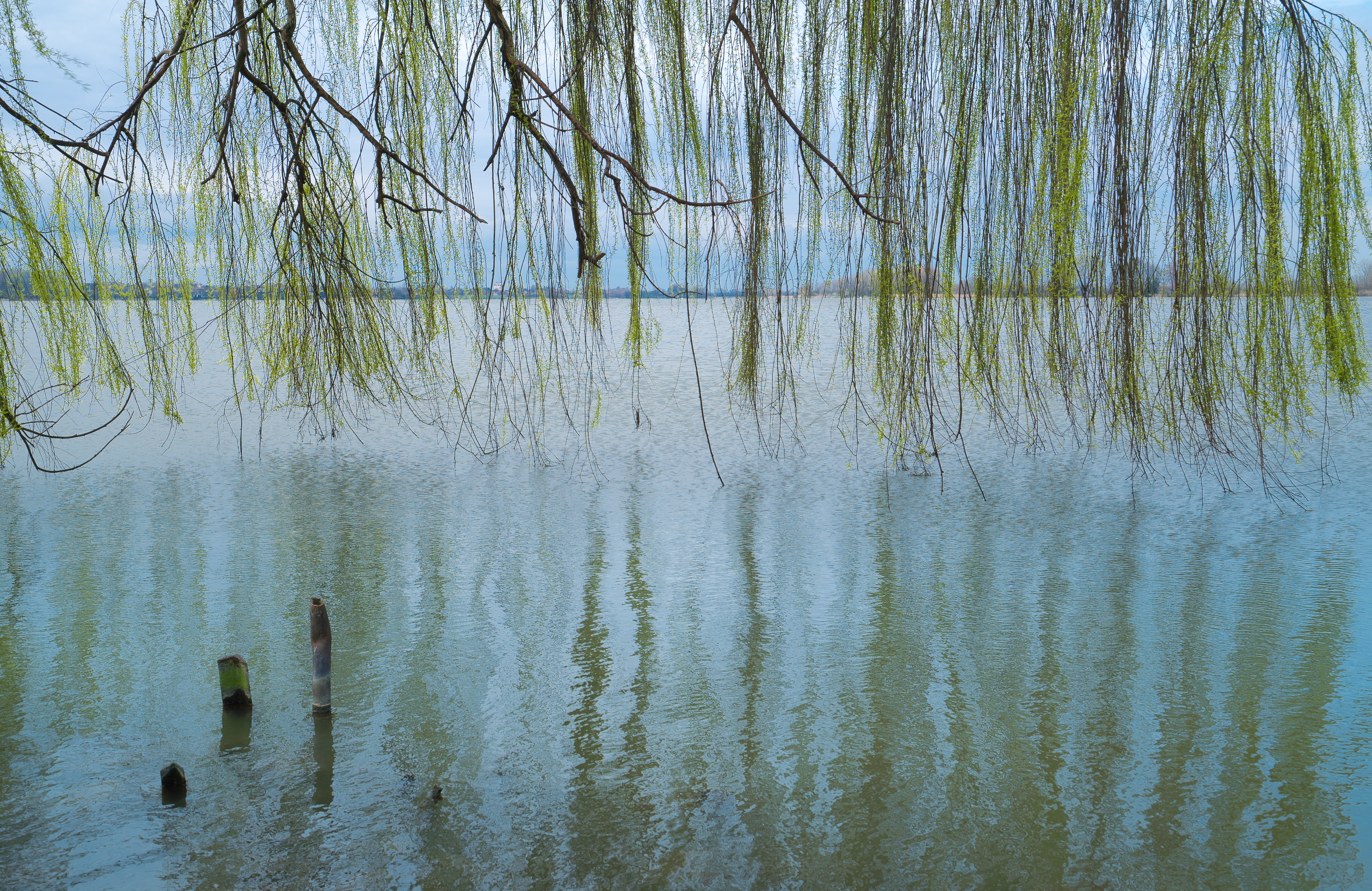 Очень интересный снимок! Длинные плавные линии веток дерева действительно образуют лаконичный свето-теневой узор, привлекая внимание зрителя за счёт формы и насыщенного зелёного цвета. Вы совершенно верно обратили внимание на выразительные отражения на фактурной водной поверхности с лёгкой рябью, они создают в кадре дополнительное зрительное пространство и являются хорошим примером визуальной симметрии. Так держать!
