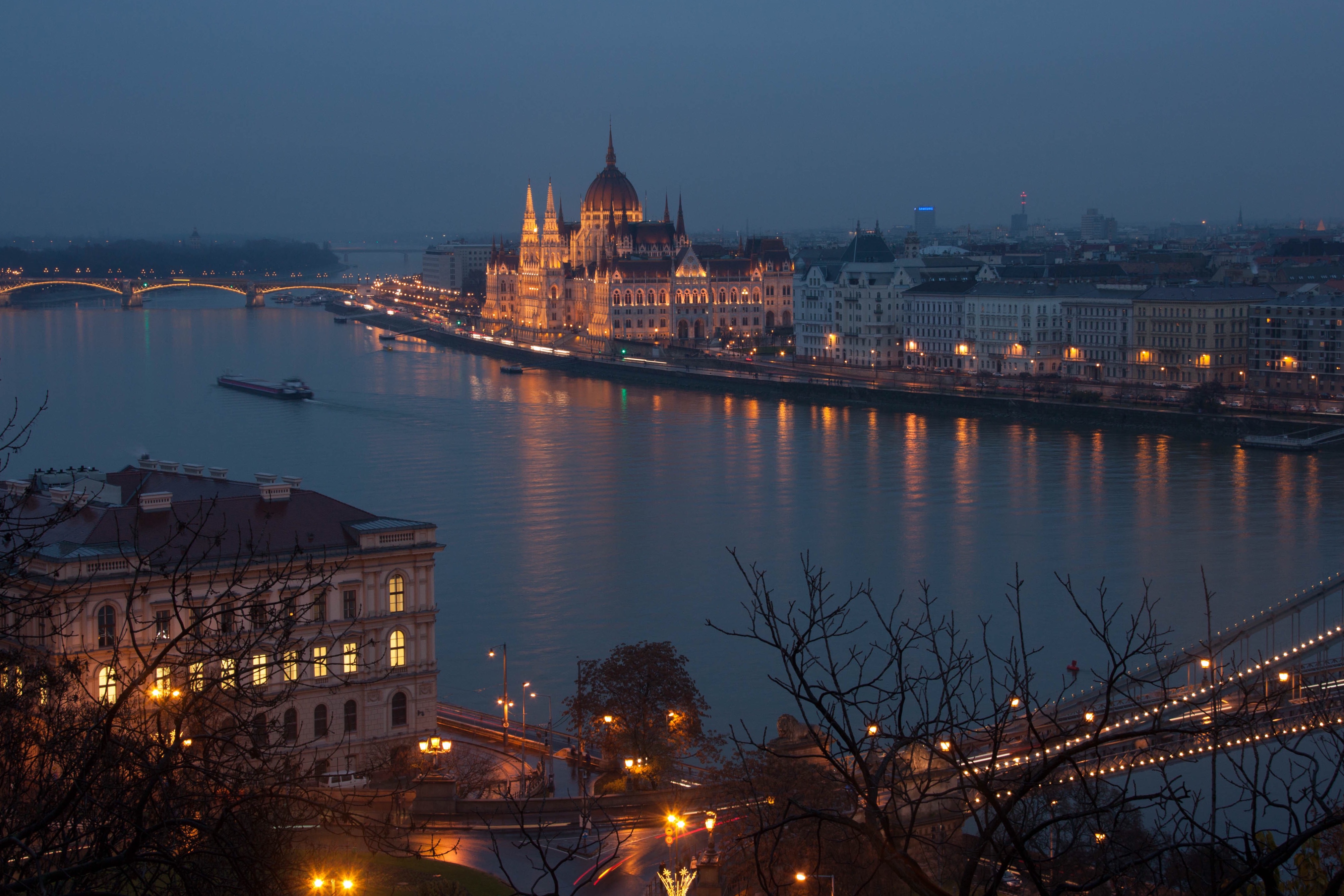 Теперь пейзаж выглядит ровным. Красивая подсветка здорово выделяет детали городского пейзажа. Он выглядит праздничным и таинственным. Город живет активной жизнью даже ночью. Кораблик добавляет динамики сюжету.