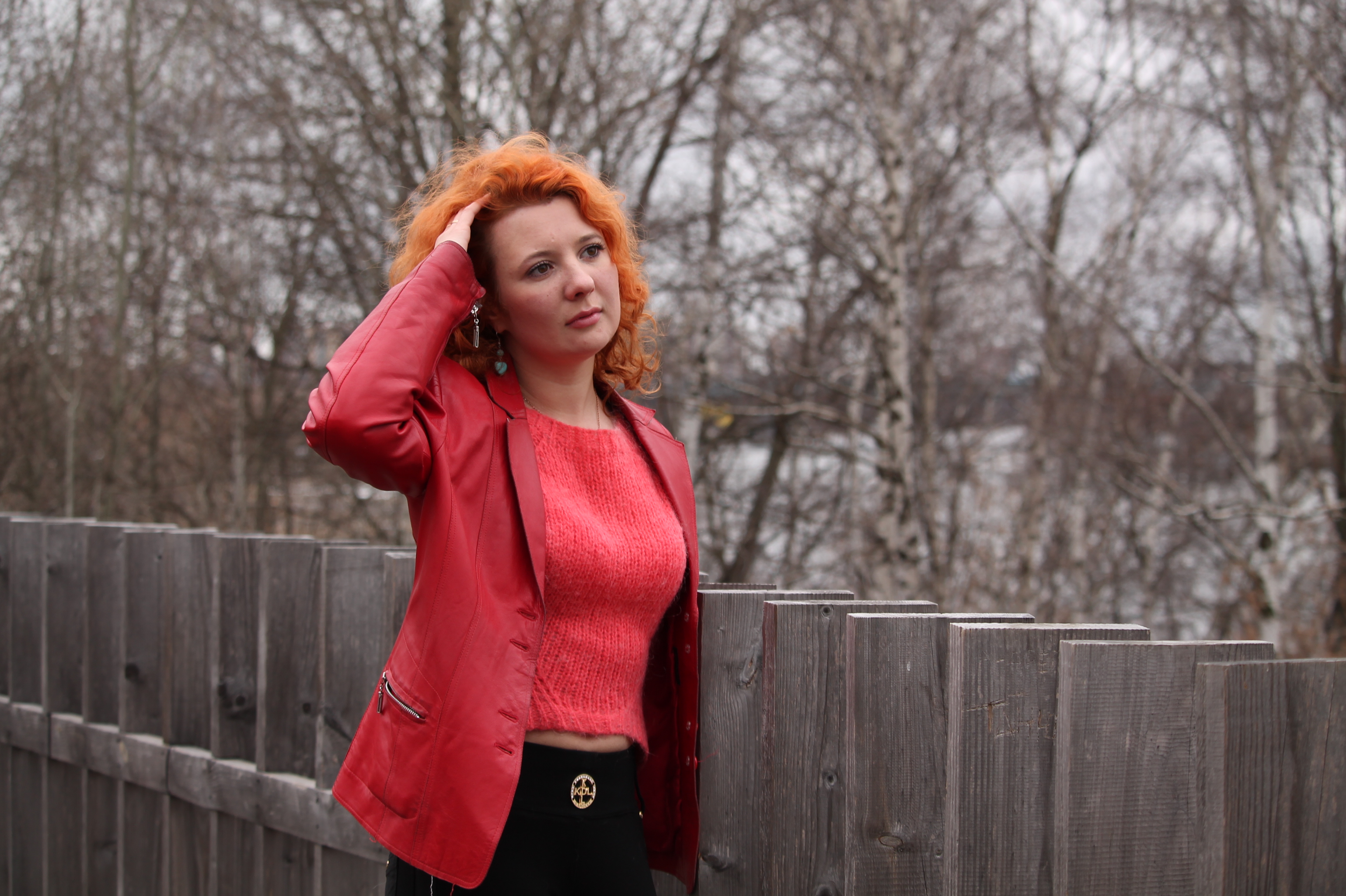 Красная одежда выделяет объект в пасмурную погоду на "сером" фоне. Забор создает ритм в снимке, Объект чуть смещен от центра, но не по правилу 1/3,- так снимок более гармоничен. Взгляд в сторону и положение объекта создает небольшую интригу.