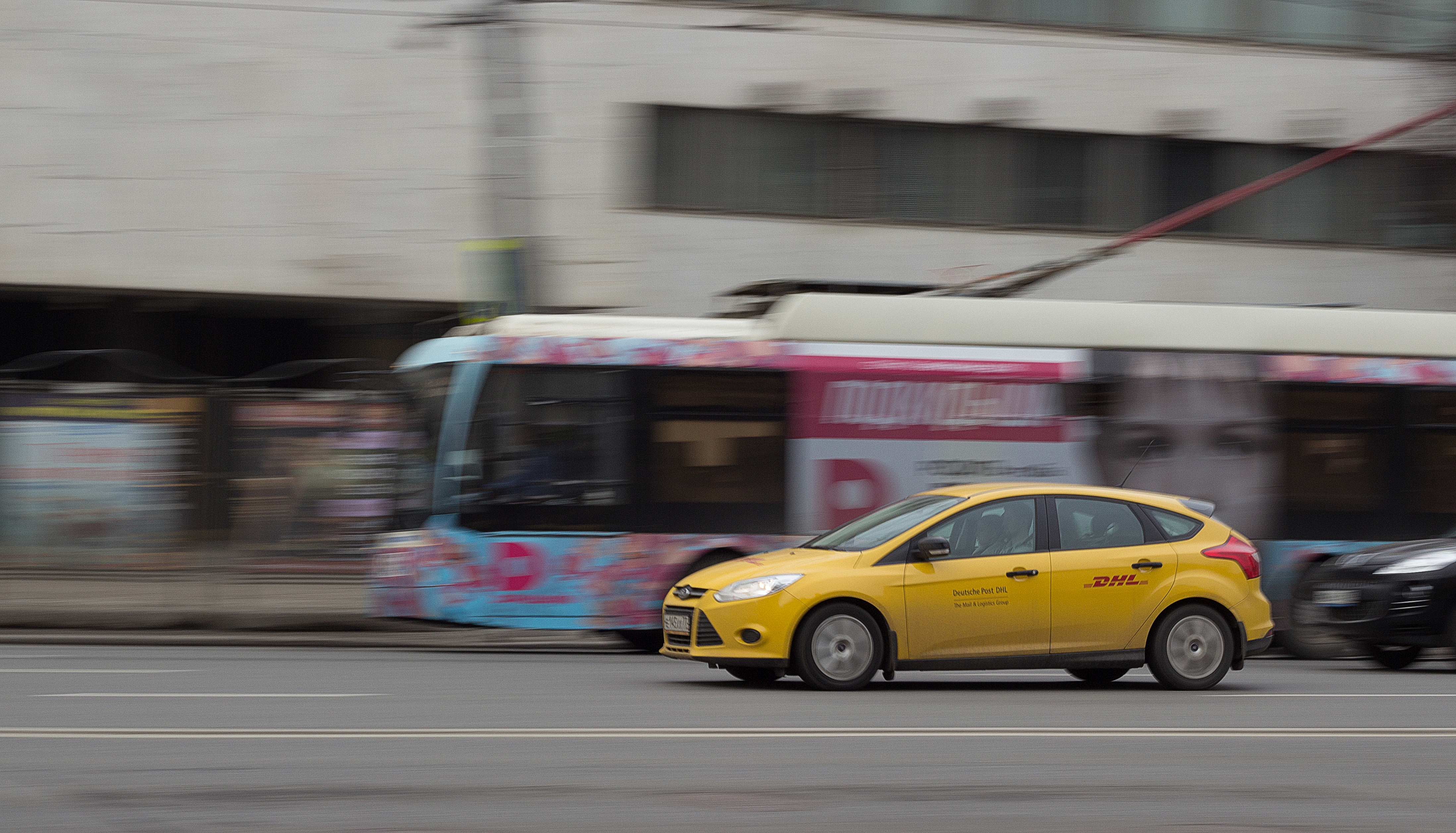 Добились удачной резкости, этим заметно выделили ключевой автомобиль и тем эффектней окружающий его смаз. Кроме того, цвет автомобиля выгоден для акцентирования внимания. Смаз снижает активность фоновых объектов, кроме того, что передает динамику. Но фон не абстрактный, объекты читаются, и у вас получился целый сюжет, в которой транспорт мчится как на перегонки.