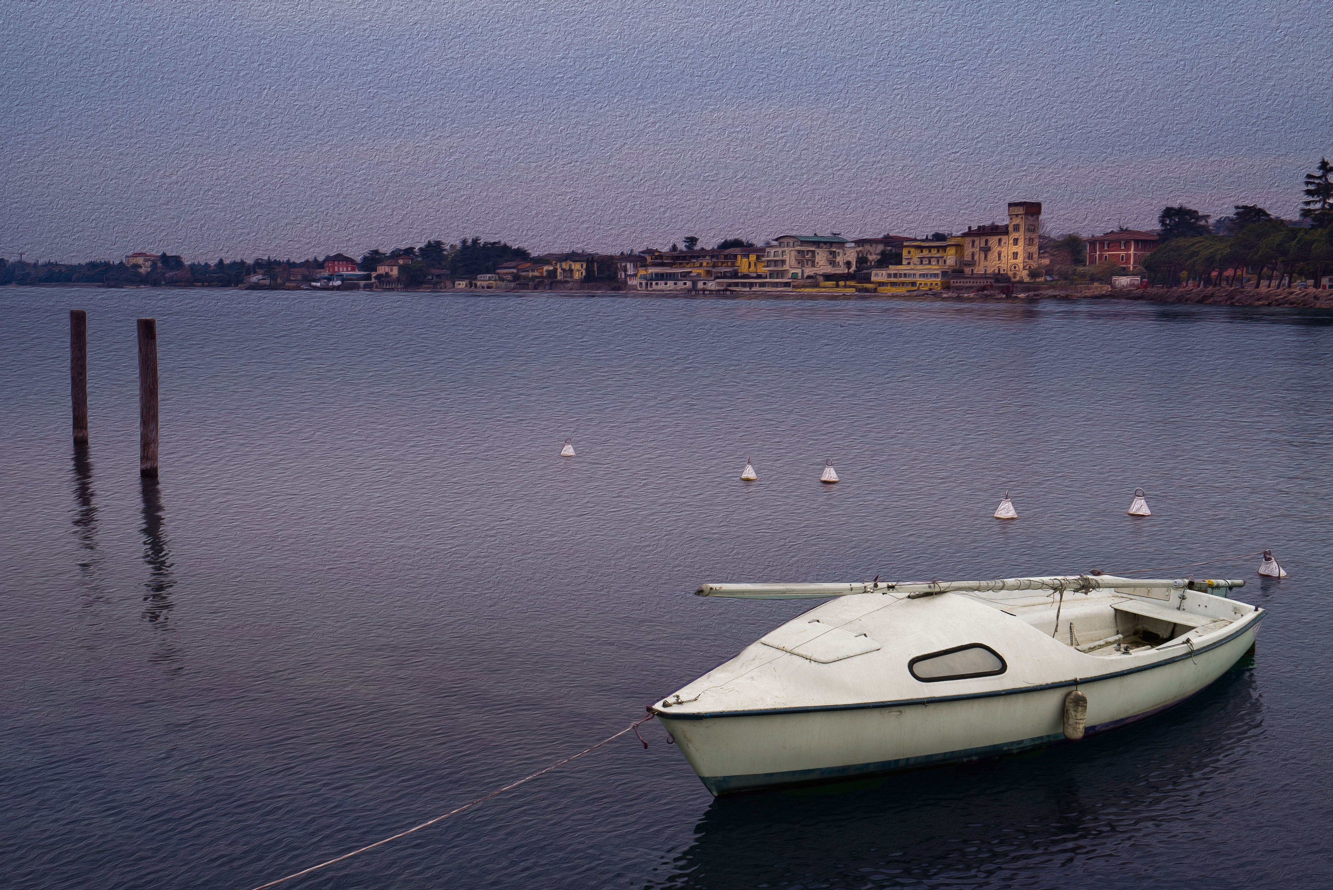 Выделила лодку магнитным лассо, а к фону применила цветовую коррекцию и эффект масляной краски.