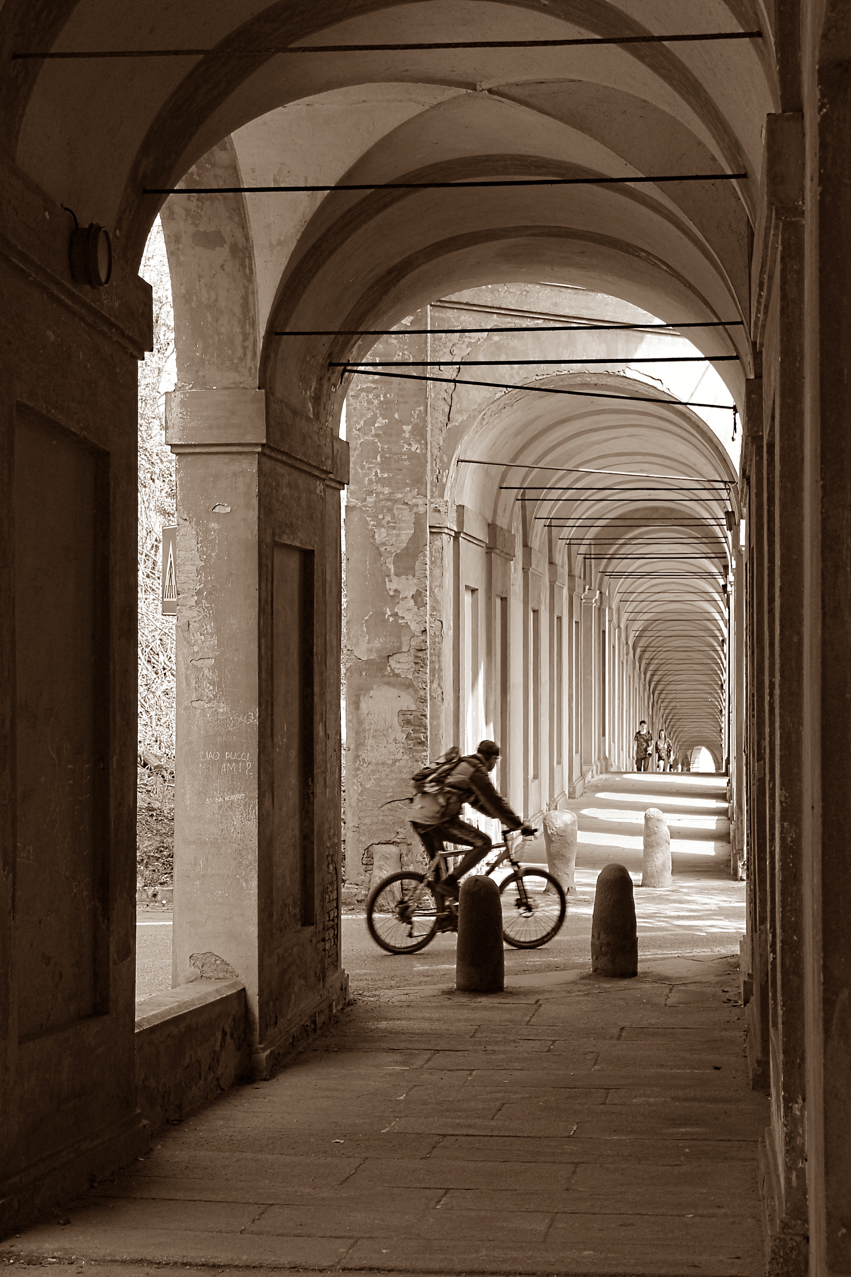 здравствуйте, высылаю фото на работу с перспективой. режим сепия, на мой взгляд, подчеркивает старину галереи, а велосипедист разбавляет ее статичность...
