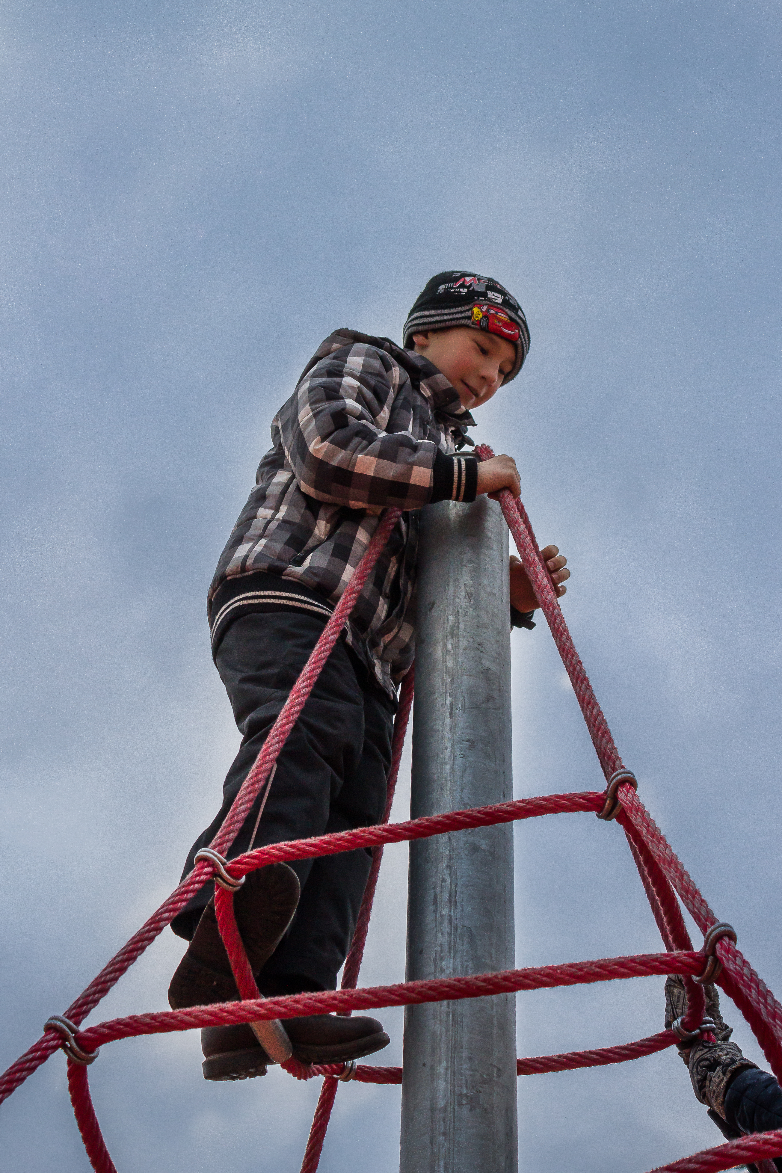 Хотелось бы разместить середину горы по центру кадра, ее форма (линии веревок) будет выделяться симметрией и мальчик, так как не попадает в нее, будет акцентирован сильнее сильнее, он попадет в более активную часть кадра.