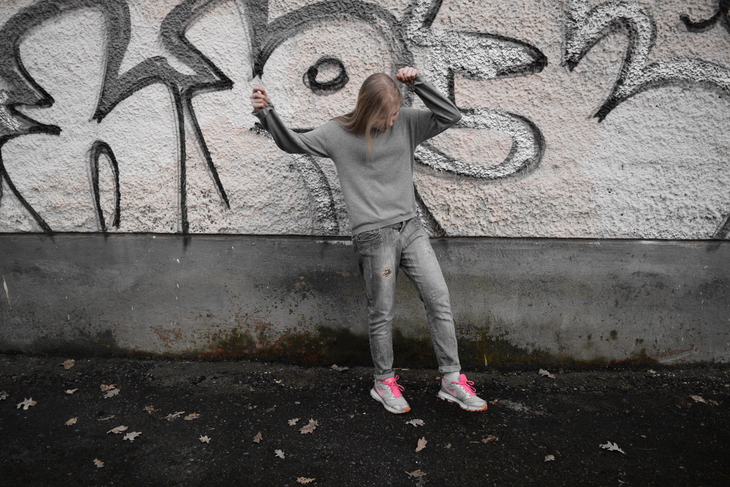 Получилось интересно! Отлично применен эффект и всё внимание ярким кроссовкам. А также и модель смотрит на них. И её поза обращает внимание на ноги. Да и фон очень удачно обесцвечен.