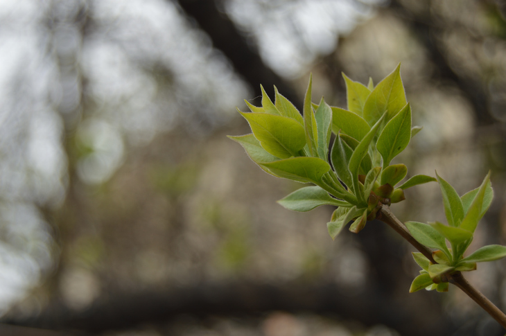 Отлично размыт фон, здесь это необходимо для снижения активности фоновых объектов. Получили тонкий акцент на молодой распускающейся веточке.