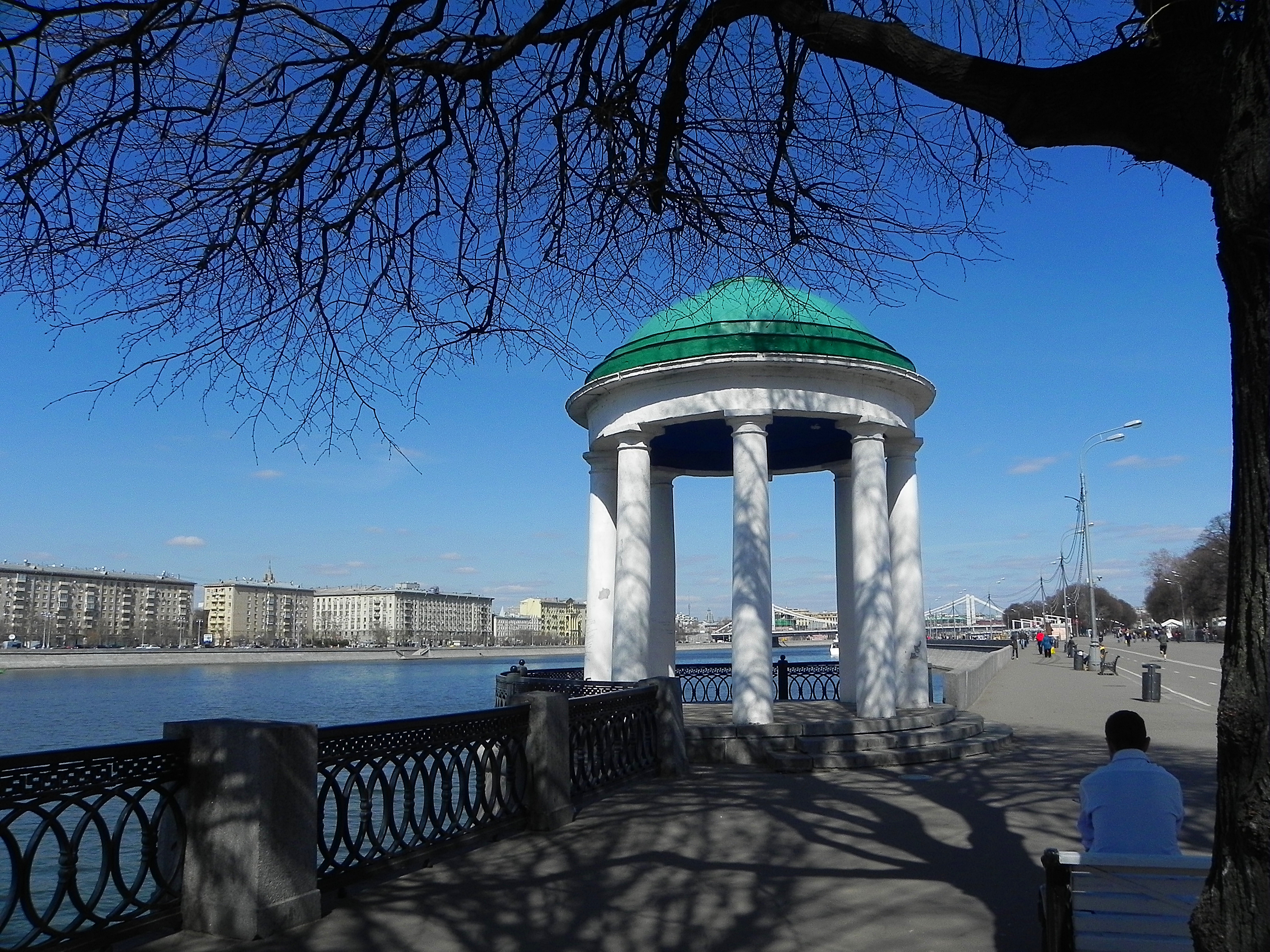 Кадр воспринимается легко и по компоновке. Отчётливая перспектива, выразительная многоплановость, а также, фигура человека на ближнем плане и беседка, словно создают эффект присутствия. Ощущение, что смотришь на всё своими глазами.