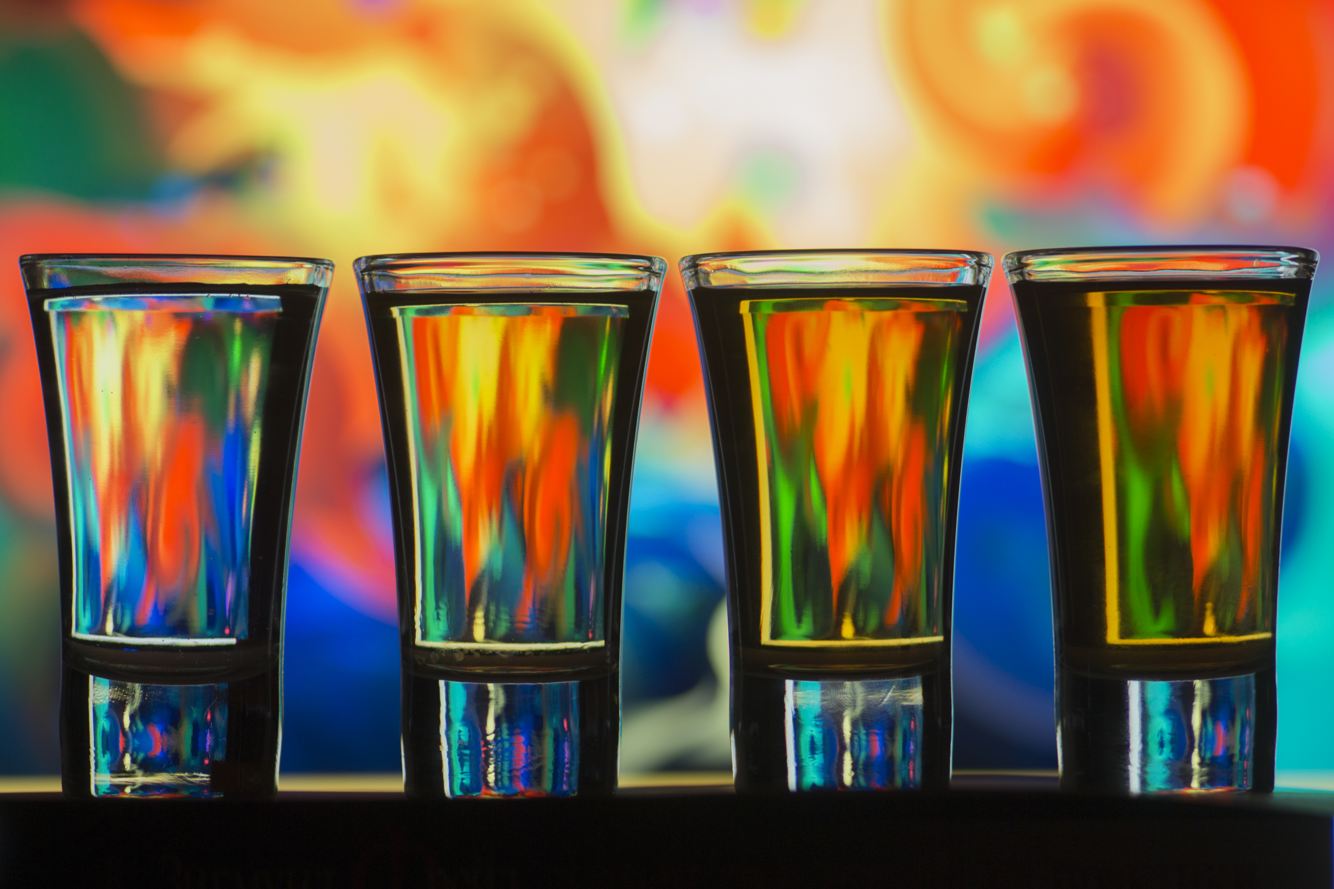 Объектив Юпитер 37А, диафрагма 3,5. В рюмочки налила воды. Слева - чистая вода, в правую сторону уходит в коричневый (добавляла чай). На мониторе открыла картинку с абстракцией, установила штатив, погасила свет. Был установлен интервал 2 сек. между нажатием кнопки и срабатыванием затвора для избежания шевеленки.