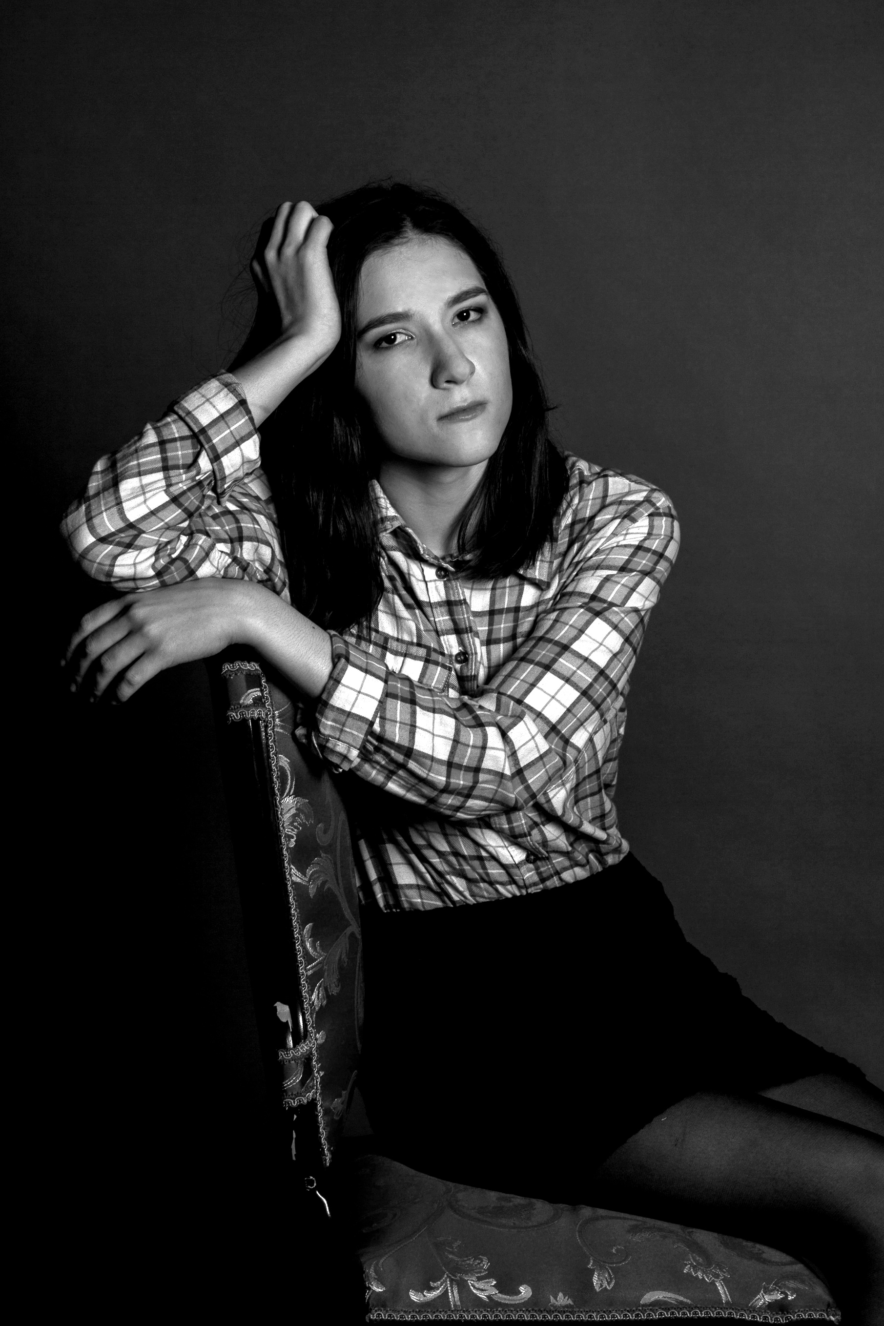 Драматичный получился кадр! И ЧБ вместе с низким ключом замечательно подчеркивают настроение героини. И угол падения рисующего света выбрали корректно, фотография смотрится достаточно объемно. :)