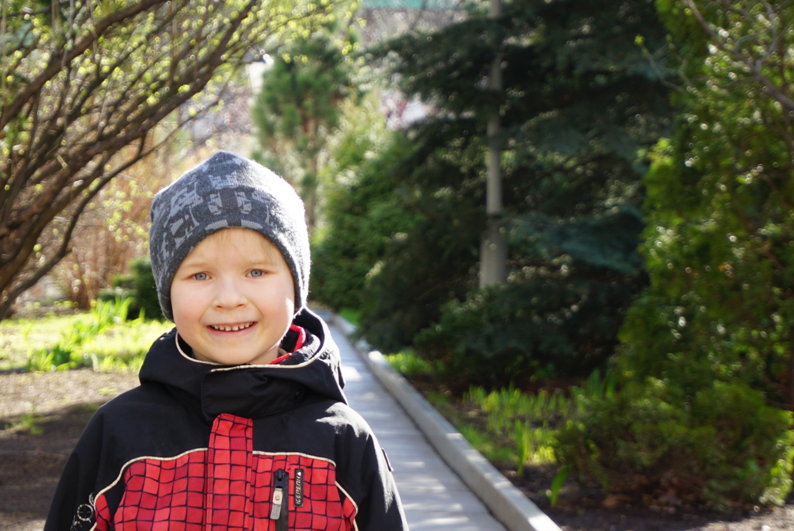 Здесь освещение гораздо более подходящее! Малыш освещен солнцем чуть сзади - это освещение называется контровым, и солнце создает яркий световой ореол, отделяющий ребенка от фона. Лицо при этом освещено более мягким отраженным светом. Благодаря положительной экспокоррекции, добились хорошей проработки теней, лицо достаточно ярким получилось.