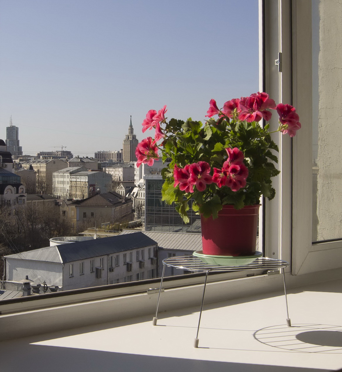 Здравствуйте! Хотела подобрать такой режим съемки, чтобы объект и дом со шпилем на заднем плане были в резкости. Сильно прикрыла диафрагму, использовали минимальное фокусное расстояние. От объекта пришлось отойти подальше, насколько позволили габариты помещения. Кадр кадрировала, чтобы убрать лишние детали окна. Цветок разместила по линии третей.