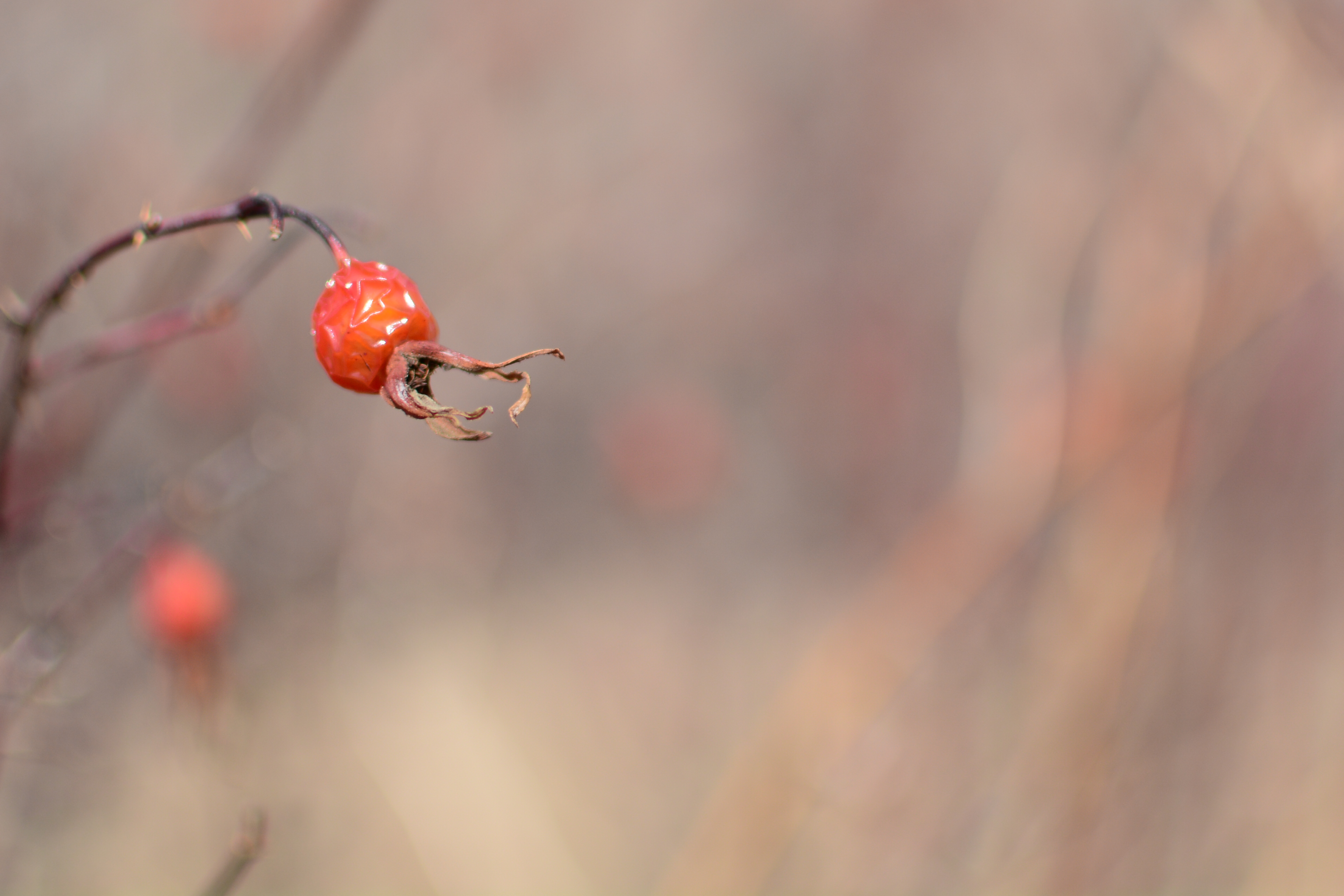 Ягодка шиповника отлично выделена в кадре резкостью а так же цветовым акцентом. Съёмка на открытой диафрагме F1.8 и использование фокусного расстояния 35мм позволили "увести" фон в нерезкость, глубина резкости очень маленькая. Красивое боке получилось)