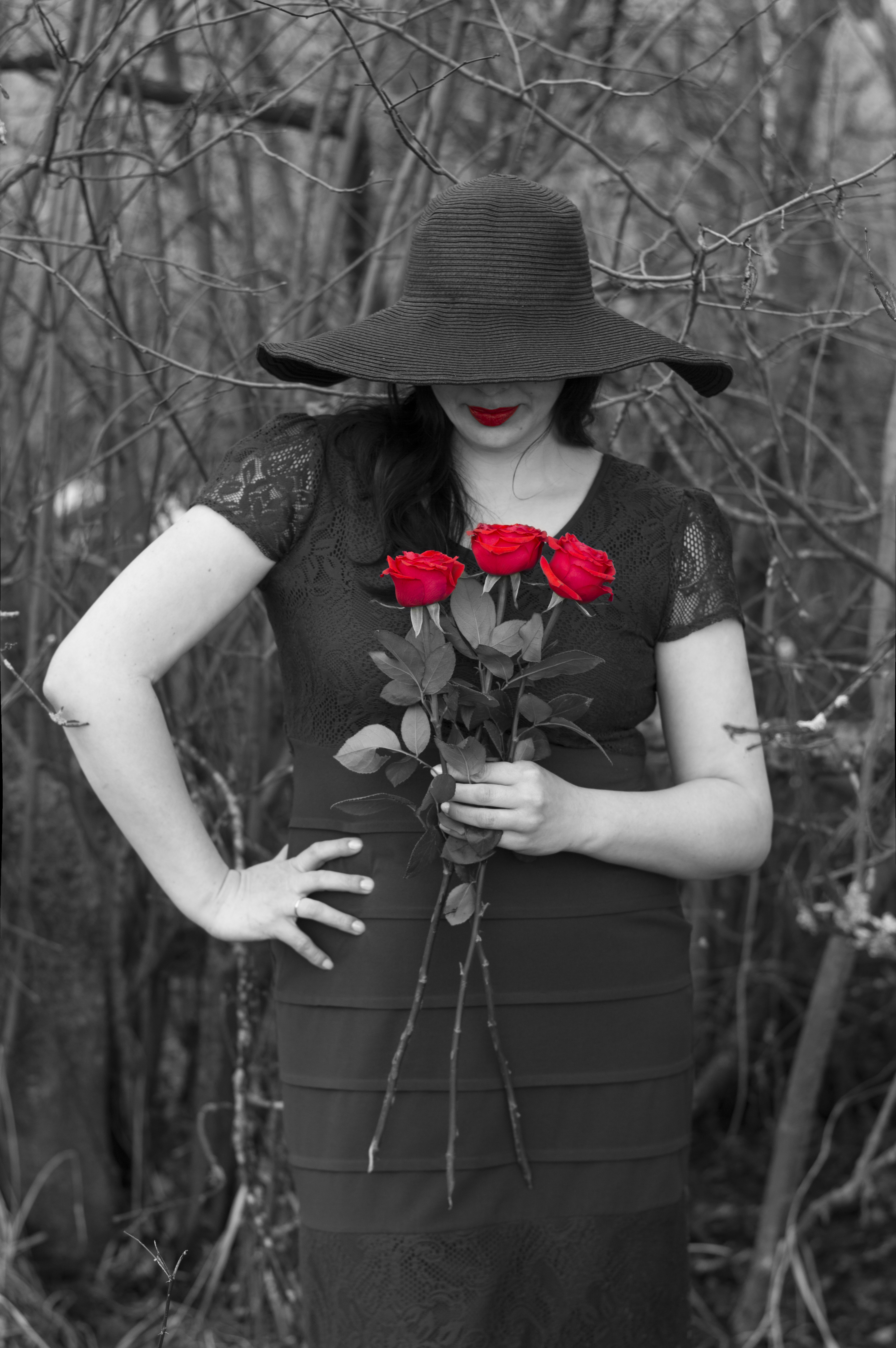 Добрый день.Подкорректировала форму рук,подбородка.Перевела в чб,сомневаюсь не сильно ли красные розы оставила.Спасибо.