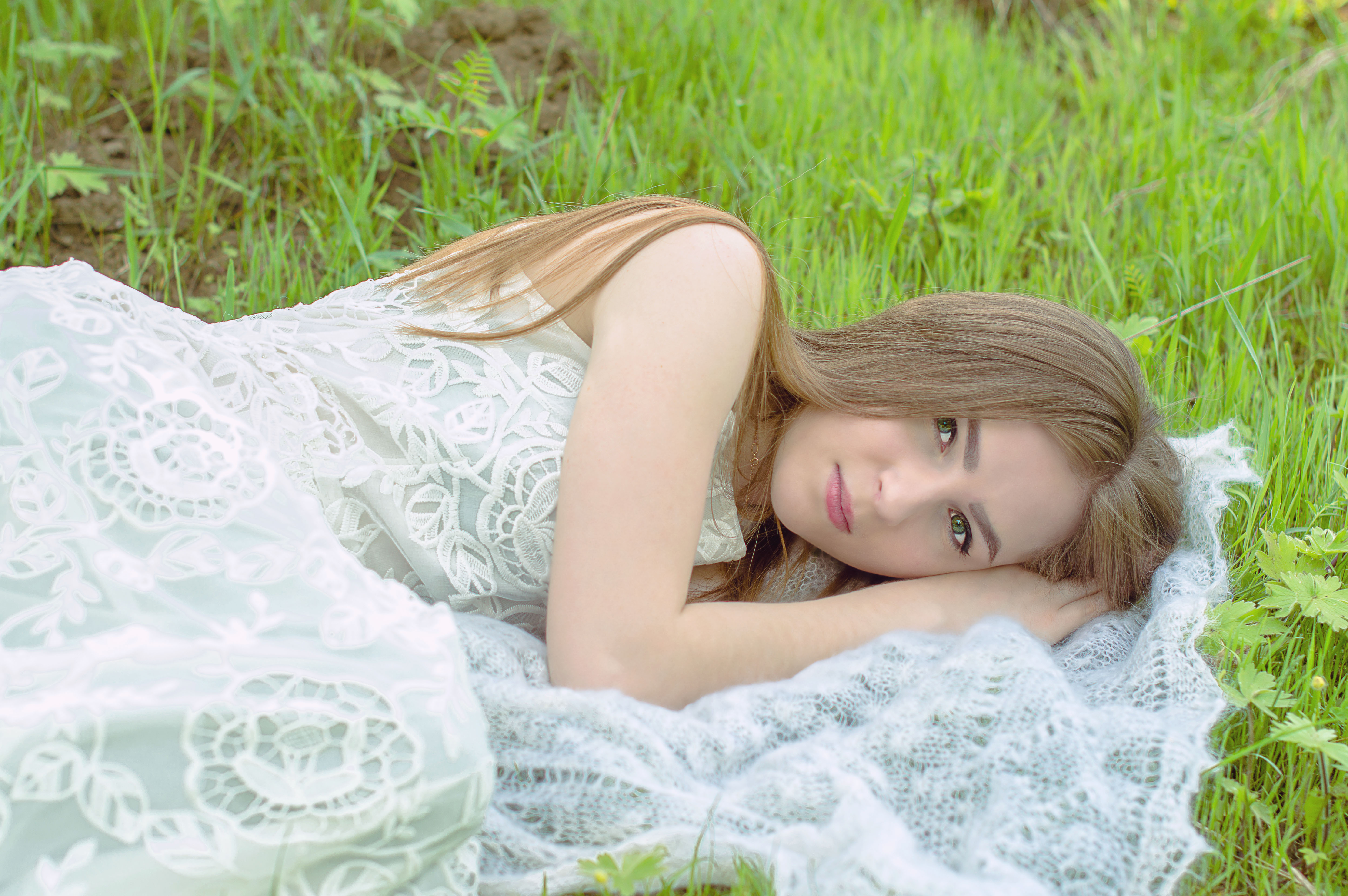 Снимок мне очень нравится! В сюжете удачно сочетаются нежная внешность девушки, невесомое кружево ее наряда и молодая травка. Прямо портрет весны получается! Поза эстетична. И по настройкам камеры замечаний нет.