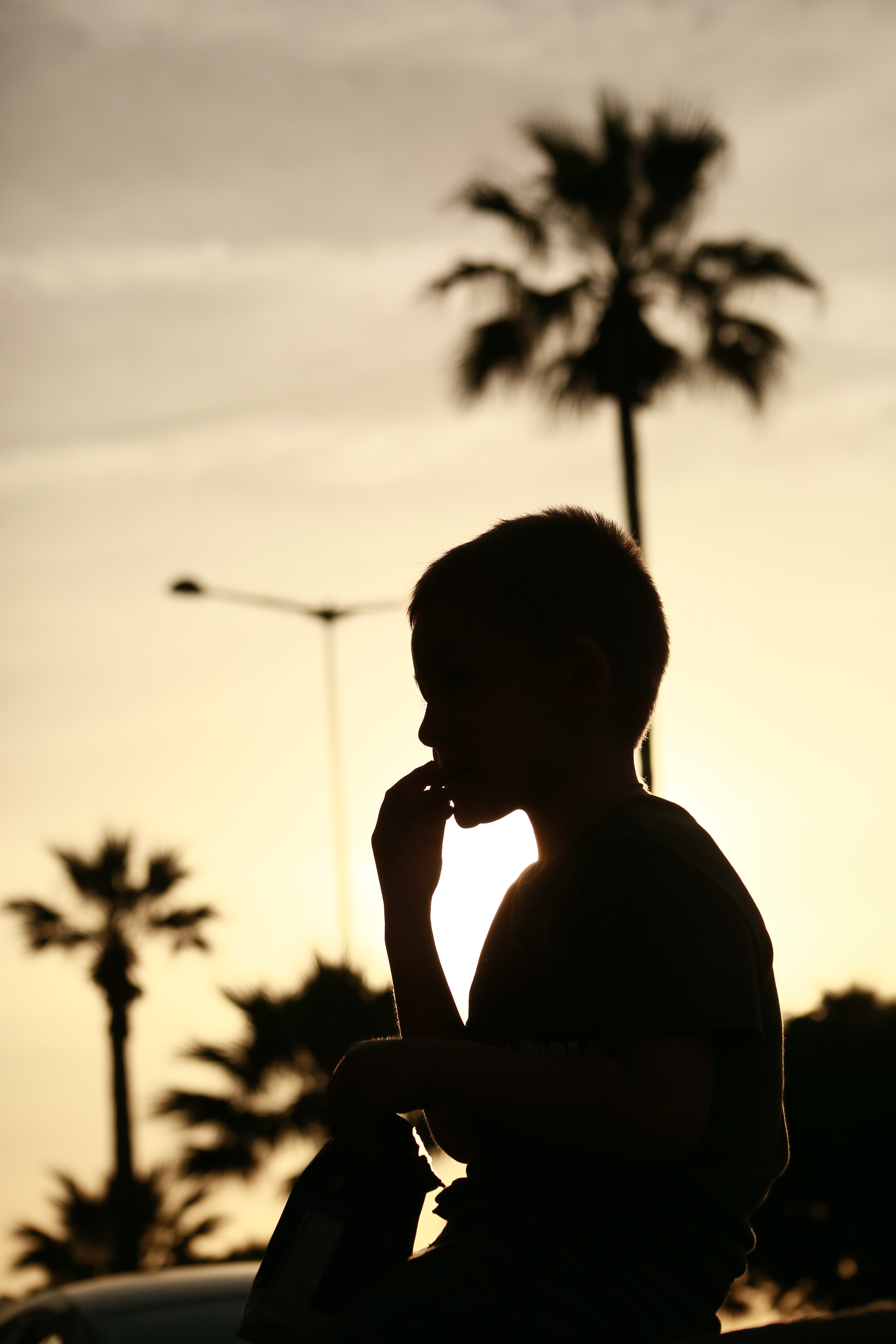 Мальчик развернут к камере боком, профиль его здорово выделяется на фоне яркого неба. Камеру точно сфокусировали на него.