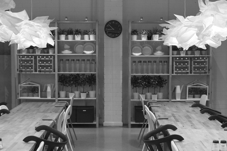Столовая для сотрудников на работе. Работаю в ИКЕЕ). Объектив Samyang 35 f/1.4 без атофокуса, снимал на авто-ISO поэтому высокий уровень шума. Обработка Lightroom: перевод в ч/б, добавление зерна.