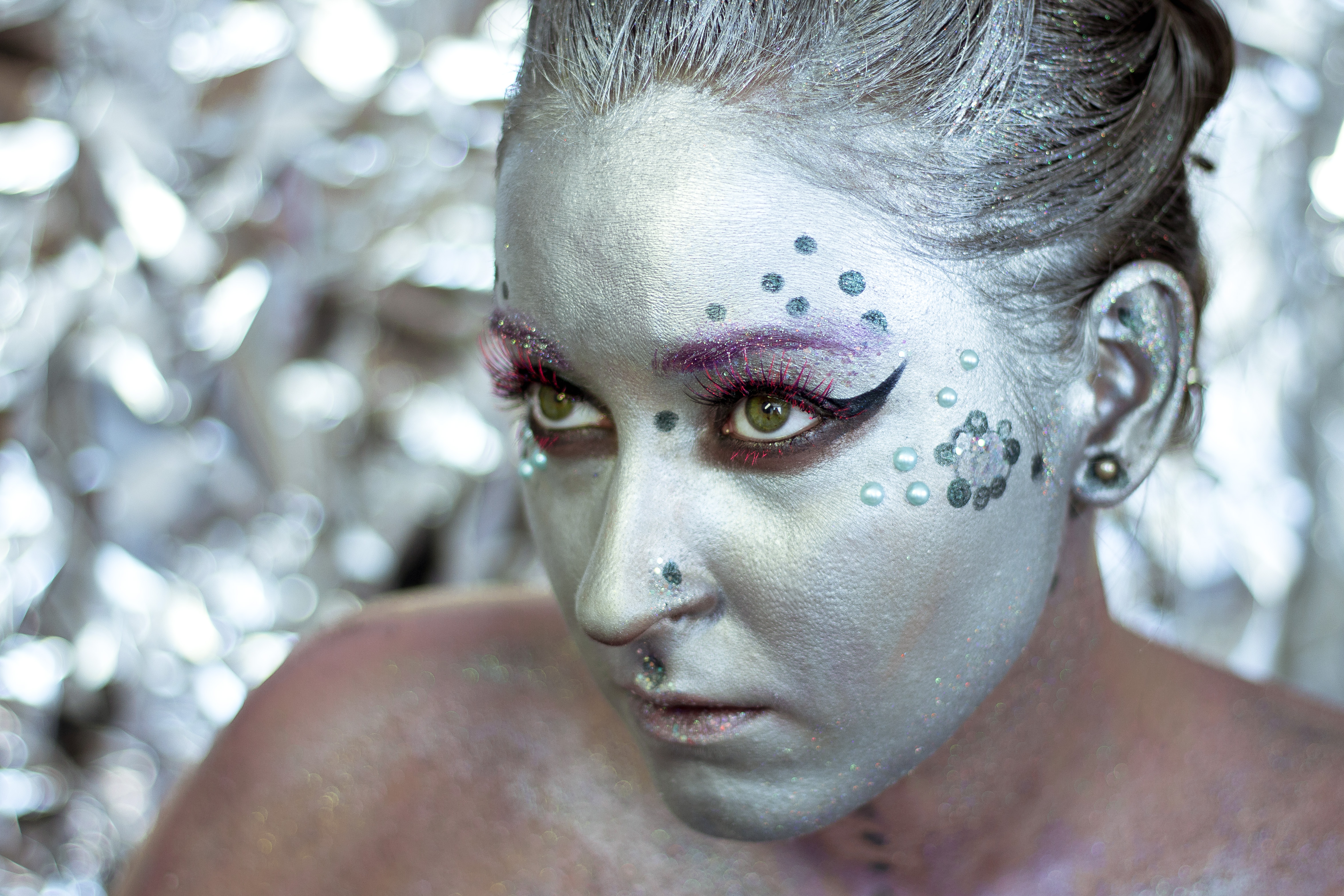 Фотография конкурсного макияжа. Для более эффектного размытия фона и компенсации плохого освещения использовал открытую диафрагму. Центр кадра смещен для большего пространства для взгляда.