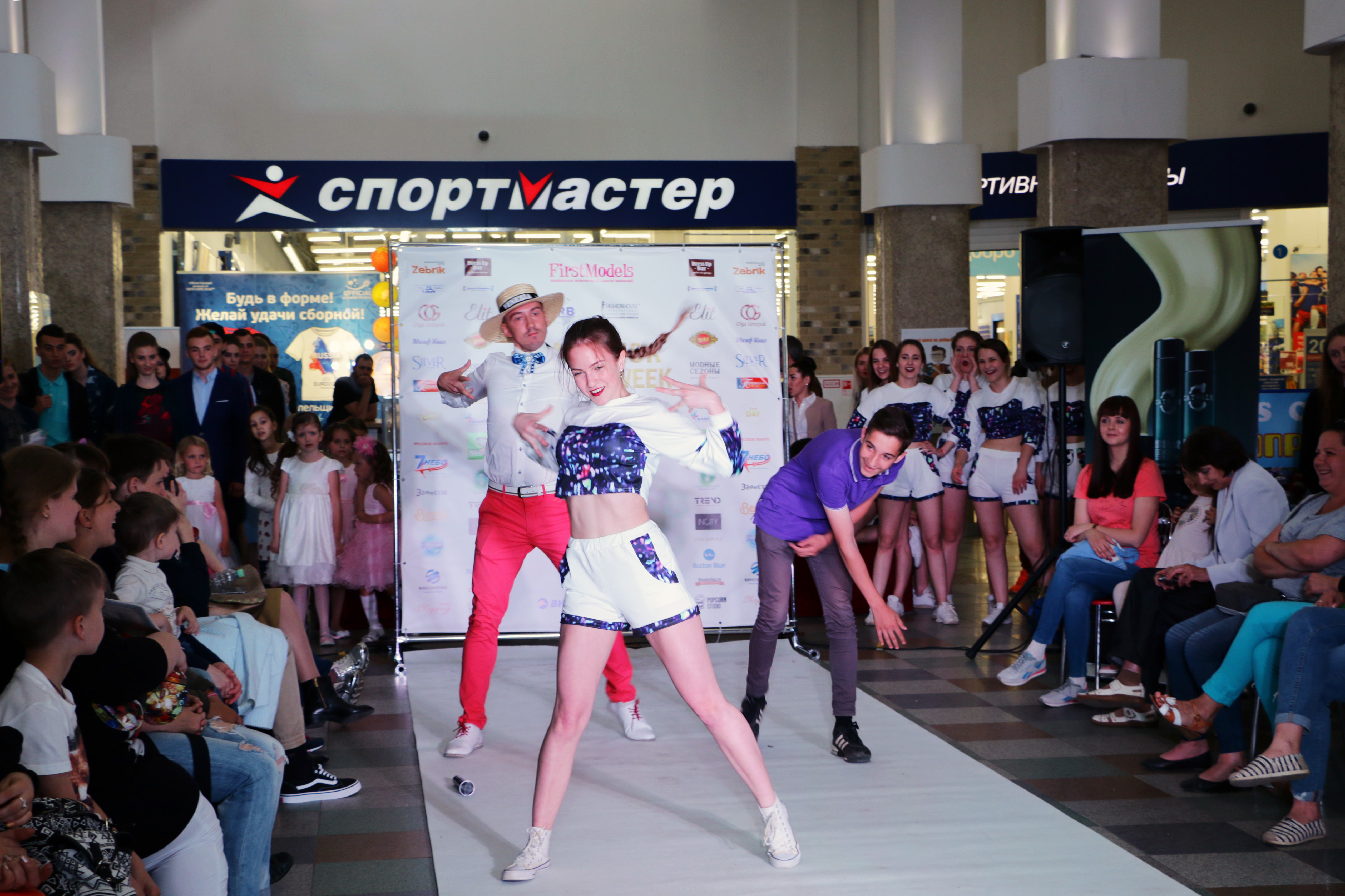 Съемка с Недели мода. Ведущий и его помощники развлекали гостей зажигательными танцами. Благодаря небольшому размытию динамика снимка усилилась.