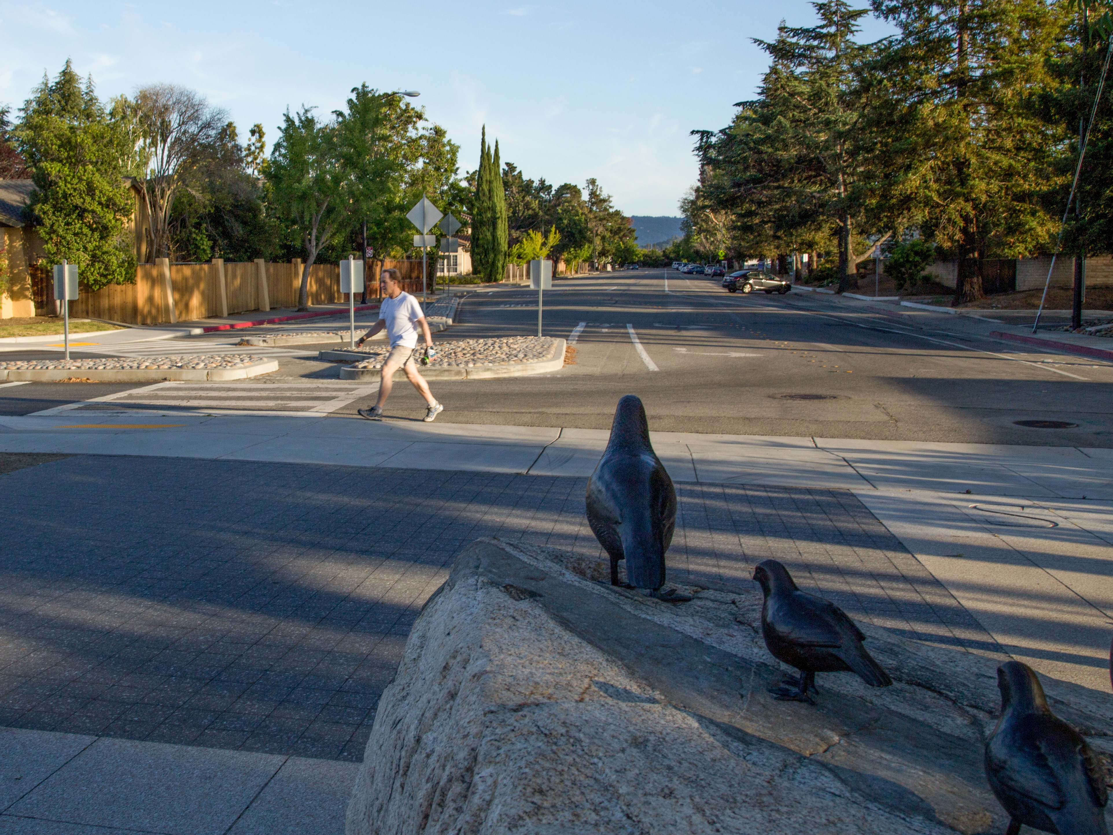 За моей спиной находится пешеходный мост через трассу. Чтобы машины не вздумали через него проезжать, архитектор вздумал положить перед мостом большой камень а на нём почему-то бронзовые голуби. Мне показалось забавным снять такую сцену будто голуби смотрят на человека переходящего улицу. Учитывалось направление взгляда и правило третей.