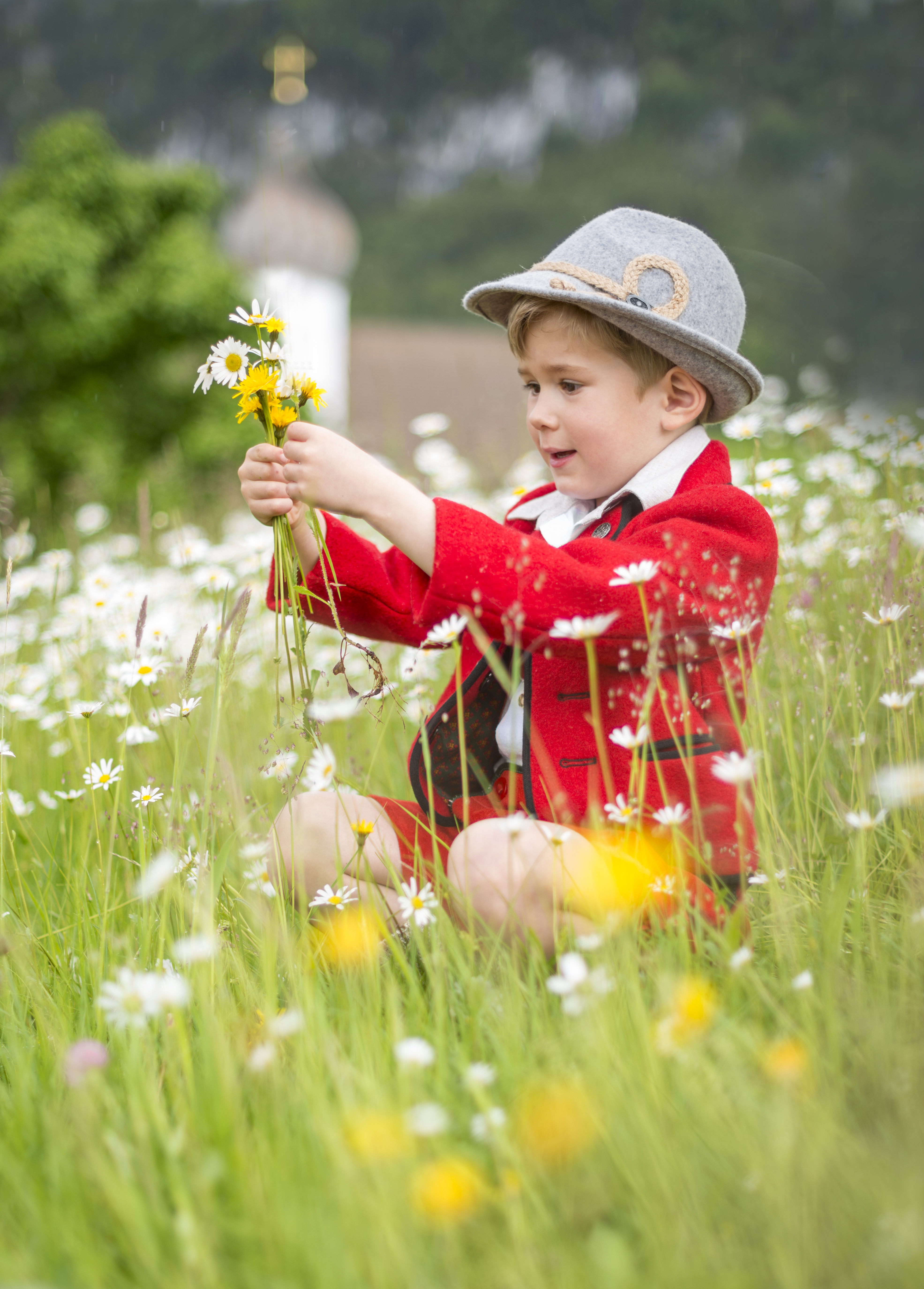 Добрый день, на Рафаэль собирает букет из альпийских цветов. Одежда — полностью в национальном баварском и австрийском стиле. Погода — затянутое небо, накрапывает дождь.
