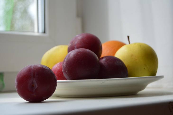 Фокус на ближней сливе, а тарелка с фруктами вышла размытой. Хотя, вполне удачно.